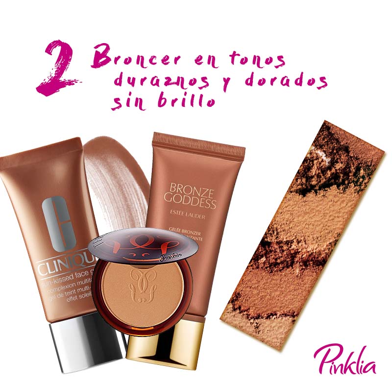 Conseguir el bronzer para cada tonalidad de piel es la mitad del camino. Los bronzers en tonos durazno o dorados sin brillo son lo que más recomiendo, sobre todo en pieles blancas. Lo mejor es usar un bronzer dos tonos más oscuros que el color de tu piel.