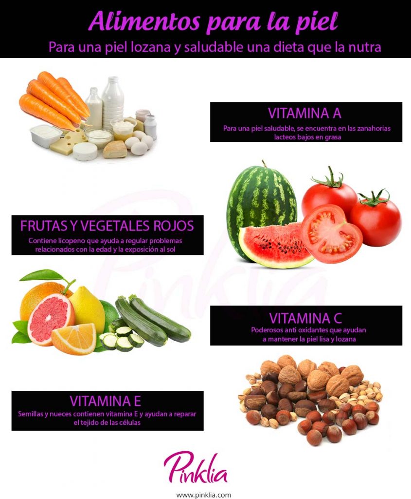 Las comidas saludables están llenas de vitaminas, minerales, antioxidantes y oligo elementos que mejoran el funcionamiento y salud de todo los órganos del cuerpo; entre ellos la piel que es el más grande que tenemos, por ese se ve altamente beneficiada de una dieta balanceada. El siguiente gráfico muestra cuales son las frutas y verduras más beneficiosas para la piel.