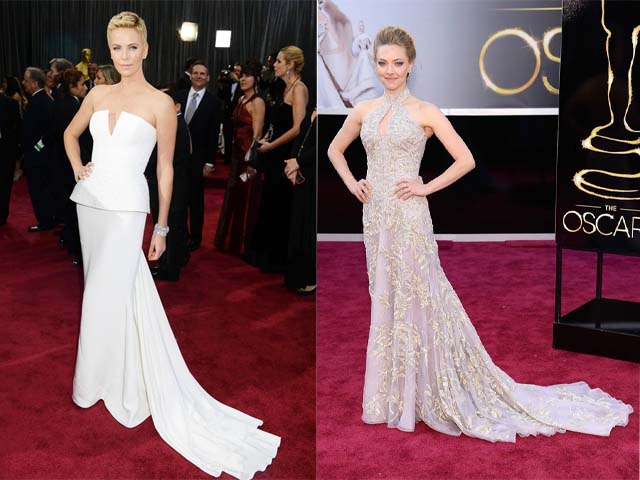 Los colores blancos y crema no se quedaron atrás, la ganadora del Oscar como mejor actriz por “El lado bueno” Jennifer Lawrence se ganó la admiración del público con un traje color crema de Dior Haute Couture, la actriz se veía como una princesa con un vestido estructurado y amplia falda donde destacaba la silueta del cuerpo. Amy Adams nominada como mejor actriz de reparto lucio un traje nude con muchos boleros en tul de Dior. Amanda Seyfried lucio un vestido recamado en tonos crema con cuello halter de Alexander McQueen. Charlize Theron se mostro con una simplicidad que la hacia lucir como las más bella de todas, con un maquillaje natural, su nuevo corte de pelo y un traje blanco de Dior con bolero para acentuar la cadera. Zoe Saldana opto por un vestido de Alexis Mabille, aunque el cinturón le resto elegancia.