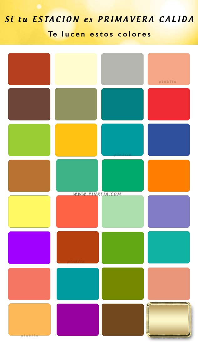 A la mujer perteneciente a la primavera cálida le favorecen los tonos primaverales en el sistema de color de la 4 estaciones, sin embargo estos colores deben tener un matiz cálido, porque la calidez es característica predominante en la coloración de mujeres en esta estación. El salmón, durazno, café dorado claro, amarillo dorado y el coral son algunos de los colores más favorables a esta estación. Los verdes con un poco más amarillo en su composición también lucen espectaculares. Evita los rosados y rojos con matices azulados, pero algunos azules te favorecen por tener una tonalidad cálida como el teal y aguamarina cálido.