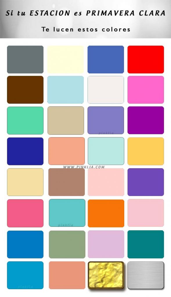 Las personas pertenecientes a la estación primavera clara tiene el color de piel, cabello y ojos claro, un contraste diferente al que manejan las estaciones de invierno y otoño fuerte, por eso si tu color de pelo y ojos son oscuros la paleta de color que más te favorece puede ser invierno u otoño fuerte. Los tonos de primavera clara le queda muy bien a una mujer de ojos azul claro, azul grisáceo,verdes, avellana o café muy claro. El color de pelo puede tener un rango de rubio dorado, rubio beige o rojizo y el color de piel es claro como marfil con un matiz durazno.