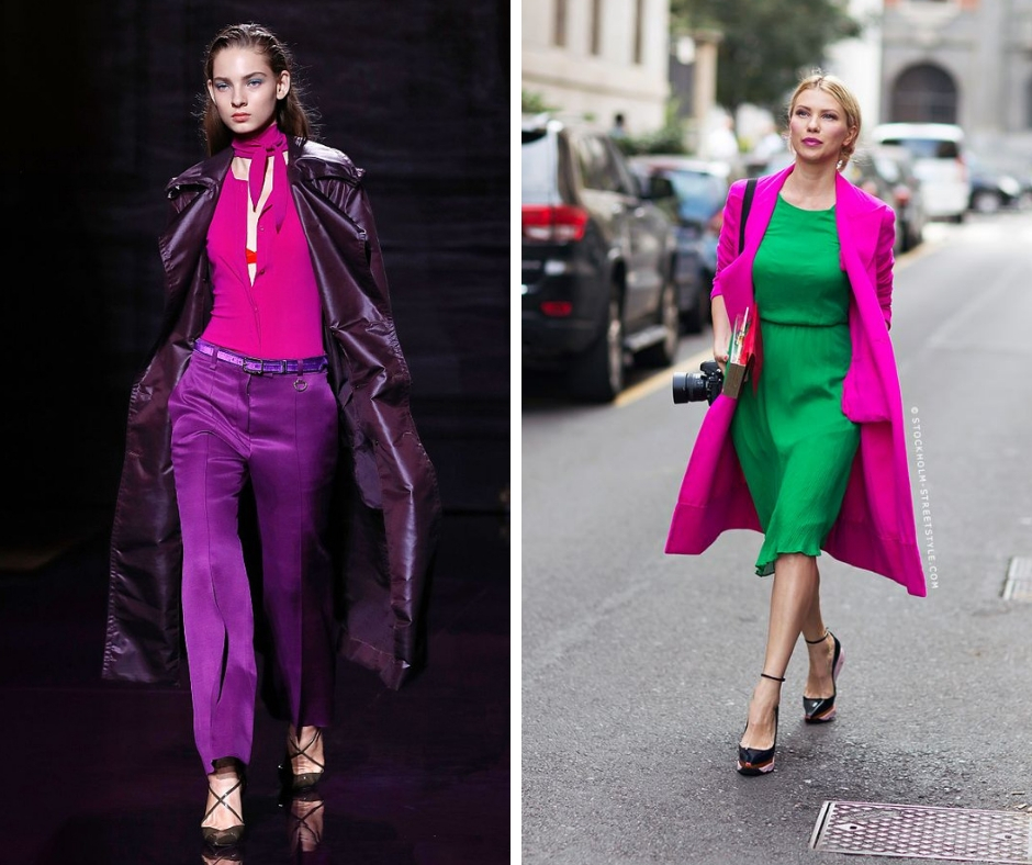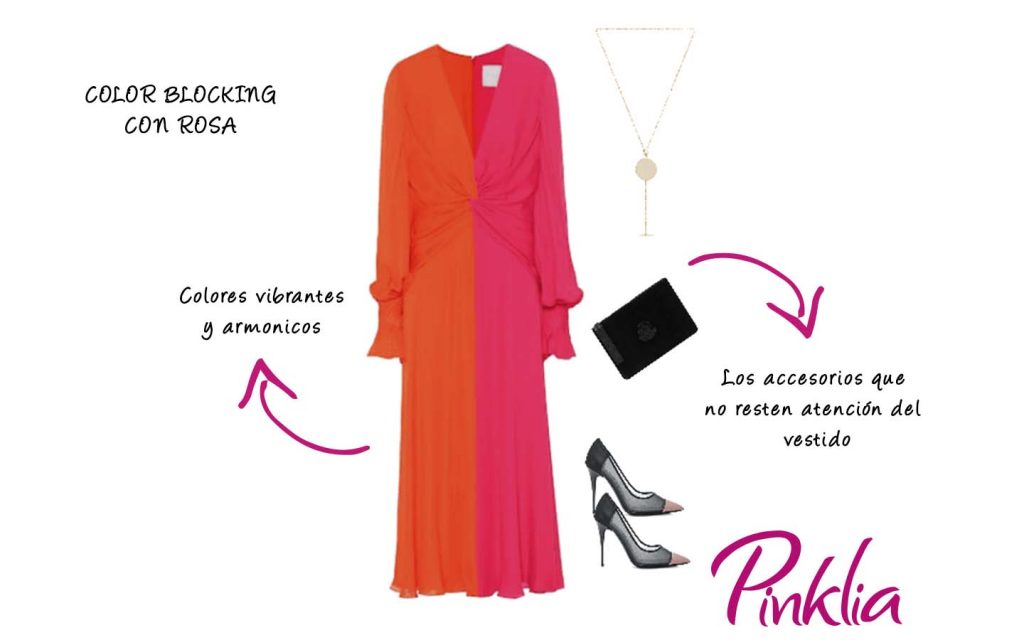 - Los colores fucsias, que son un poco más fríos que el rosa coral lo puedes combinar con otros colores alegres. Desde hace dos años la tendencia color blocking, usando el tono naranja y rosado, sigue de moda y es muy impactante visualmente hablando. Cuando se lleva este tipo de combinaciones los accesorios lucen mejor en tonos neutros, para que no peleen por atención con el atuendo.