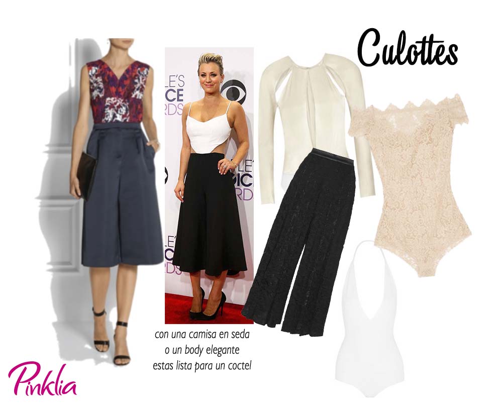 Por lo ancho que puede ser los culottes es mejor llevarlo con una camisa ajustada en la parte de arriba, ya sea de algodón, botones o una chaqueta ajustada y corta para contrarrestar lo suelto del pantalón. Se ven bien con tacones ó zapatillas, sin embargo personalmente prefiero los tacones así sean bajitos.