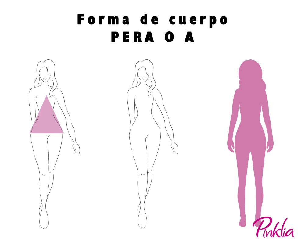 La morfología del cuerpo Pera o A se caracteriza por tener los hombros más estrechos que las caderas y los muslos. la manera de corroborar si tu cuerpo tiene esta femenina forma es medir los puntos más anchos de los hombros y caderas o muslos; si las caderas o muslos son más que una pulgada más anchas que los hombros tu forma de cuerpo es pera.