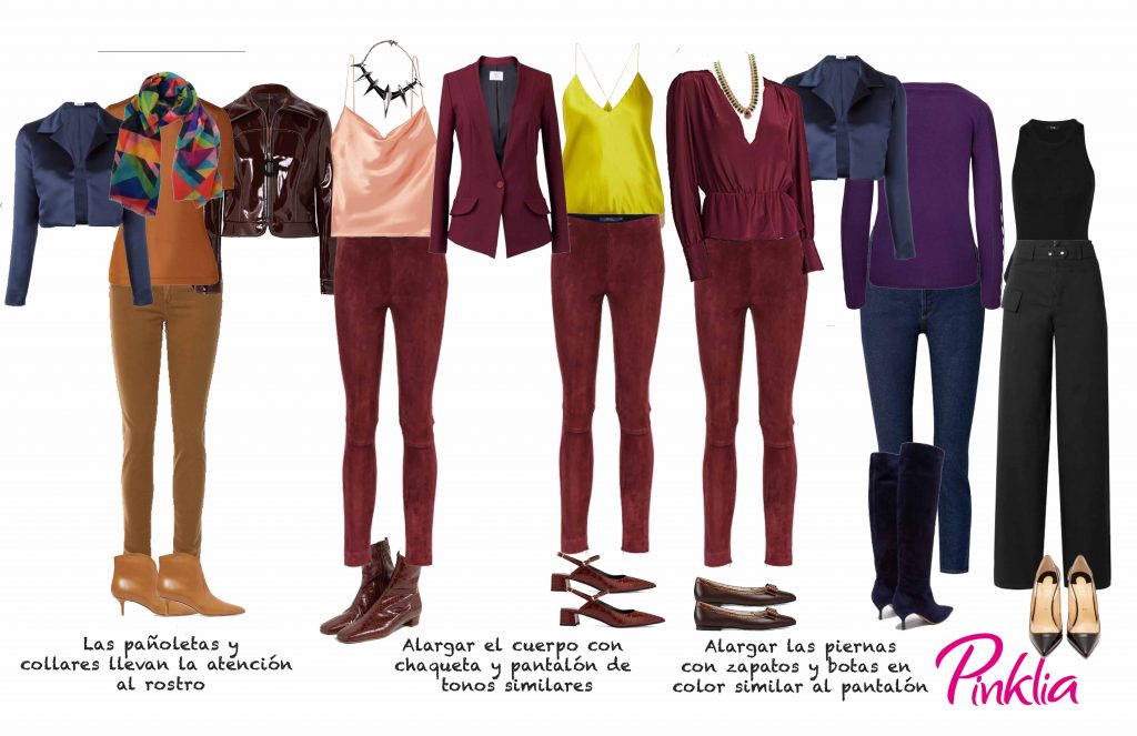 Para ganar altura por medio del vestuario es importante armar una columna de color por medio de un look monocromático completo. También puedes lograrlo creando una línea de color desde el centro del cuerpo hasta que termina la pierna.  También puedes crear la columna de color desde la prenda exterior: Una gabardina de color similar al pantalón o falda.