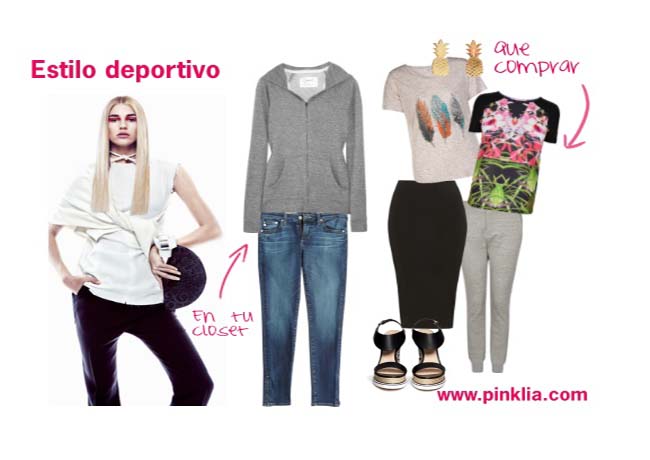 Si valoras por encima de todo la comodidad, te gustan las cosas sencillas y buscas la funcionalidad en la ropa, tienes un estilo deportivo a veces te gustan prendas bohemias o preppy, lo que te da un look deportivo casual. Generalmente en tu closét podemos encontrar pantalones o jeans cargo, boyfriend o sueltos, camisetas o remeras, sacos, tenis o zapatos deportivos, accesorios en fibras naturales, morrales o bolsos deportivos. Tu estilo confortable puede hacerte ver descuidada algunas veces, por es trata de ponerle un toque femenino a tu look. Por ejemplo una camiseta con una falda lápiz y zapatos de suela ancha. Usa colores fuertes y vibrantes de vez en cuando al igual que accesorios grandes que le puedan dar un toque especial a tu estilo.