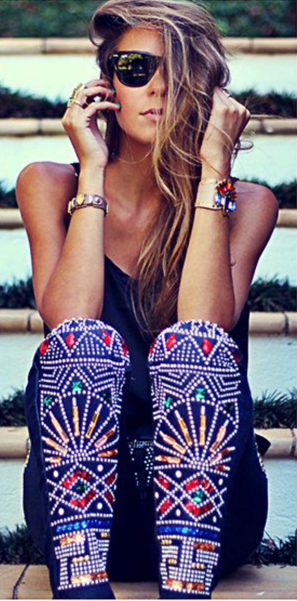 Son una forma agresiva de llamar la atención y no lo digo de mala manera. Los pantalones recamados con cristales (ya sea en una parte como los bolsillos o completamente como se están usando ahora) estan a la moda y son diferentes. Para las mujeres que es gusta tomar riesgos en su look, tienen las piernas largas y esbeltas esta es una buena opción para la noche, eso si con una camisa larga.