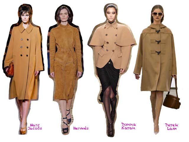 Camel, este tono es un clásico de la temporada otoño invierno y este año no podía faltar. Se vio en la tradicional chaqueta camel, propuestas por Donna Karan y Derek Lam, también fue un éxito en las pasarelas de Hermès y Rachel Zoe en materiales como cuero y gamuza. La mejor forma de usar este color neutro es con negro o blanco para esta temporada.