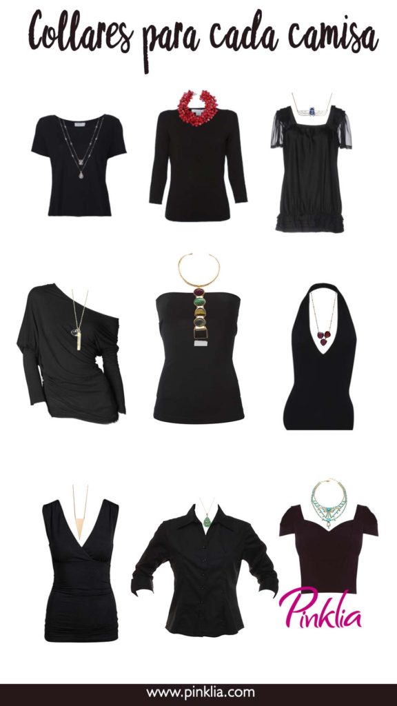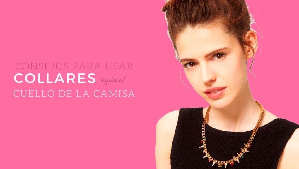 Cuando la camisa tiene una forma de cuello en V, bandeja, cuadrado o corazón aconsejo llevar un collar que caiga a la piel, para llenar el espacio descubierto, evita que llegue a la camisa. Si la moda o estilo de la camisa tiene un cuello cerrado redondo o tortuga y tu cuello es largo, usa collares cortos o chokers. De lo contrario usa collares que caigan un poco más abajo del hueso de la clavícula y ten en cuenta las recomendaciones de “Collares ideales para cuellos cortos y gruesos”