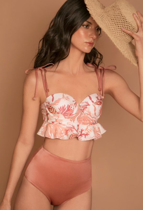 Esta nueva colección incluso puede llevarte a usar tu lado más creativo y usar las prendas de la parte de arriba como parte del vestuario.  Vemos tops tipo corsé, mangas abullonadas, asimétricos, boleros y detalles en los tirantes. Partes de abajo High waist y enterizos con escotes muy pronunciados.