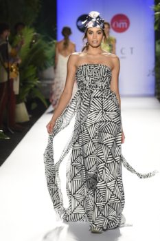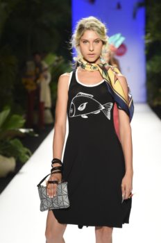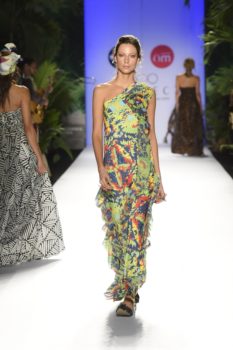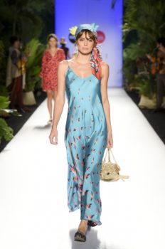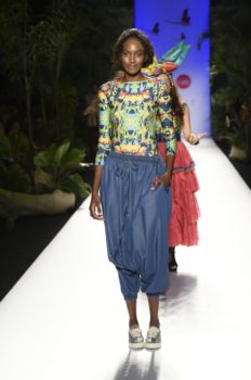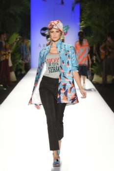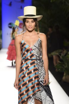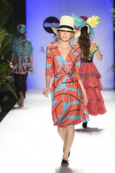 La historia no solo fue cantada, toda la escenografía, el paso de las modelos y cada una de las prendas y accesorios la iban contando a medida que llegaba a su culmen la pasarela en el marco de Colombiamoda.  Estampados como los gajos de plátano, flamingos, los azules del cielo, el colorido de la cultura caribeña y pacífica y los tonos del atardecer fueron parte de la propuesta, traducida en colores y estampados.  Una paleta vibrante como los colores que se encuentran en nuestro país.  No se puede dejar de lado los bolsos en forma de animales tropicales como el cangrejo y la tortuga que le dieron un toque mágico a la colección.
