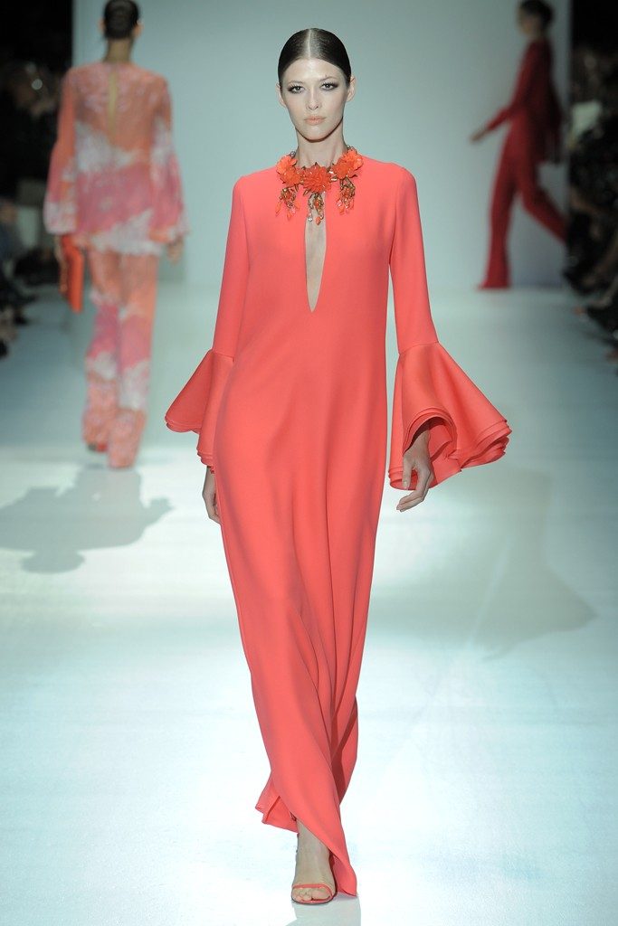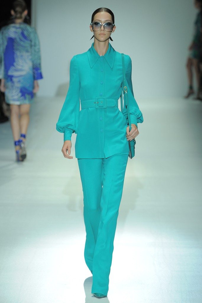En la semana de la moda en Milán la presentación de la pasarela de la marca Gucci llego con colores fuertes y estampados coloridos en tonos azules y naranjas. La mayoría de escotes se vieron en la espalda mostrando un poco de piel. También se vieron ricas texturas y varios vestidos en estampado en piel de culebra. La marca Gucci presentó una colección con moda de impacto y arriesgada para una mujer que exuda confianza en sí misma.