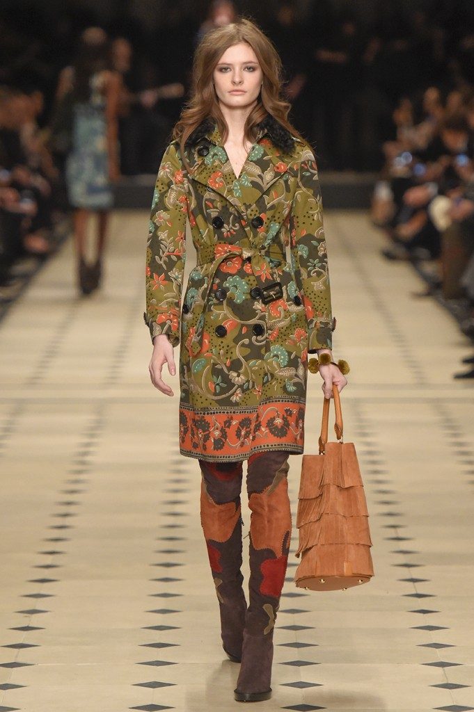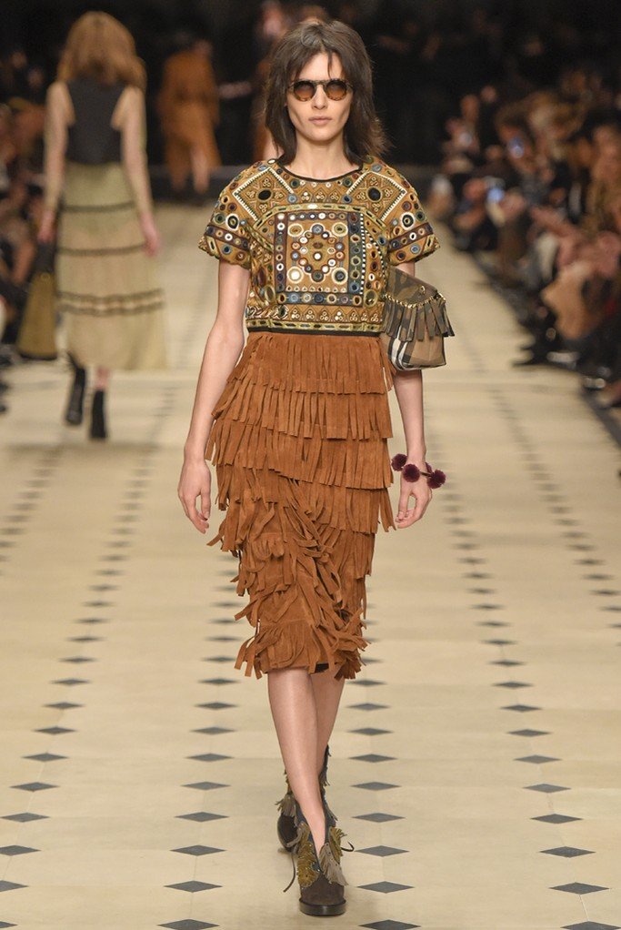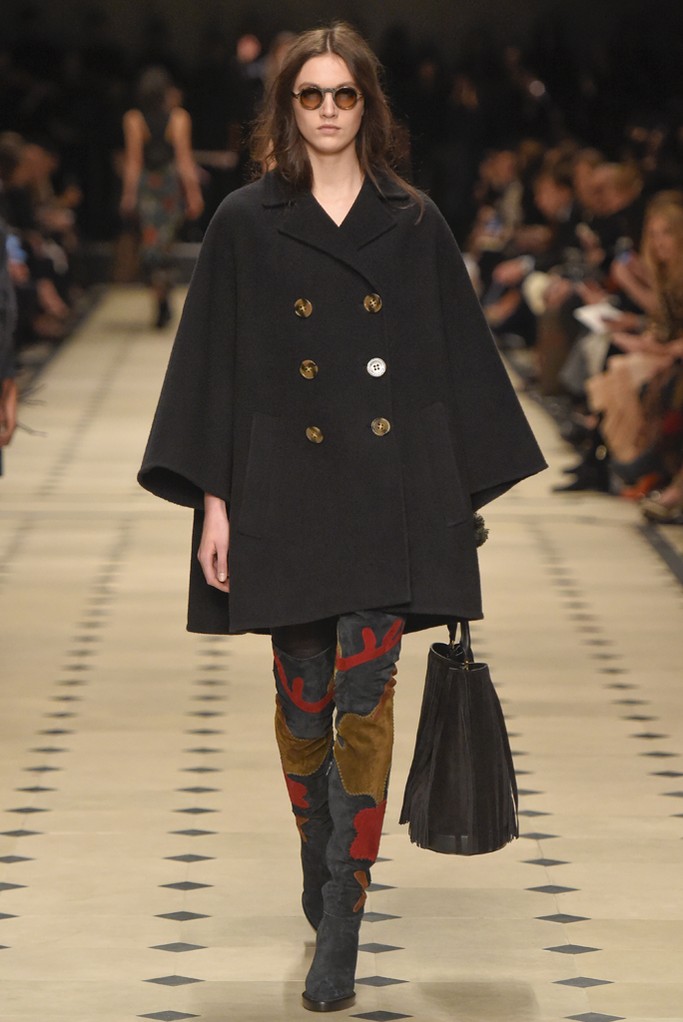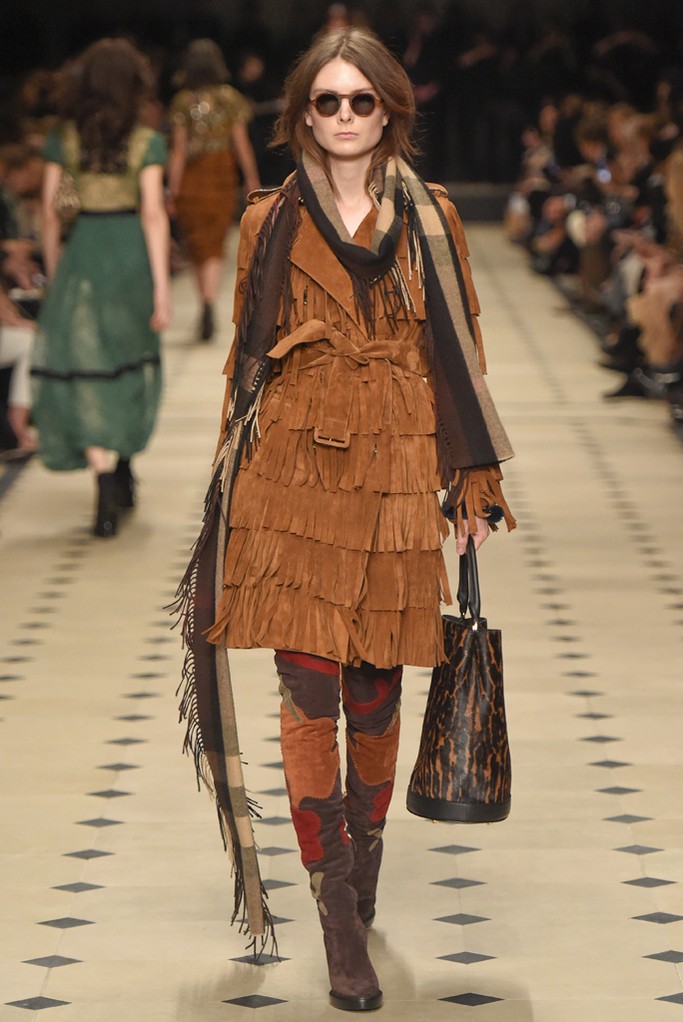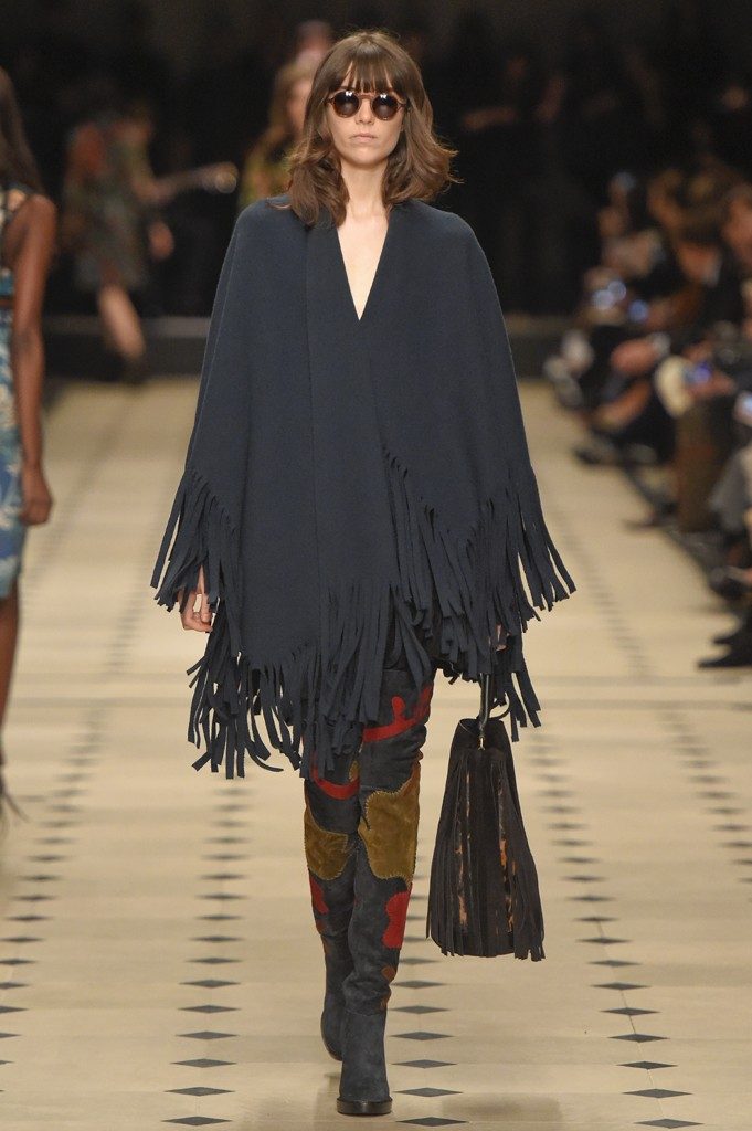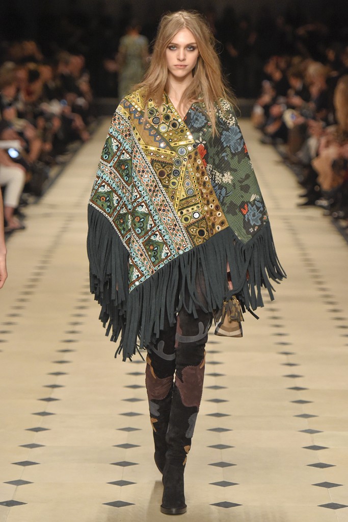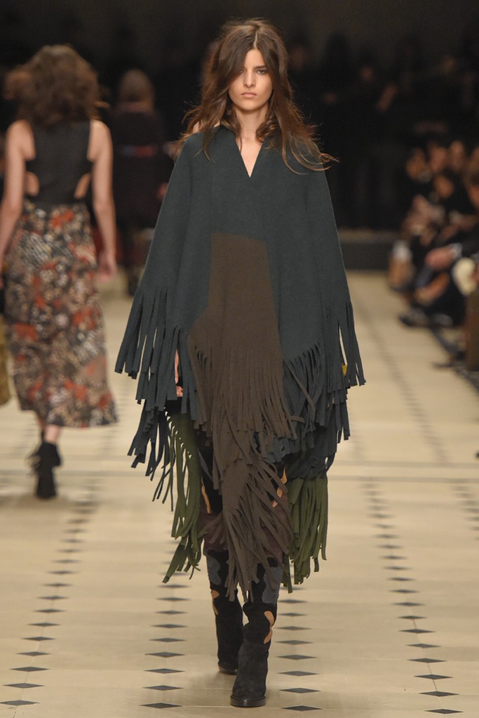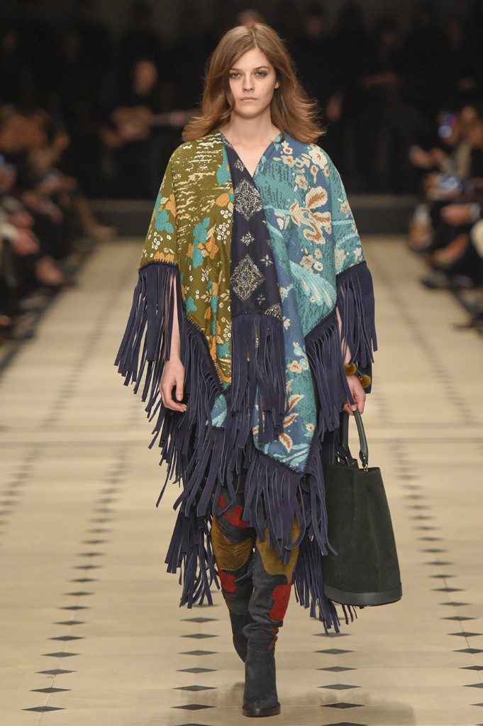 La legendaria marca que creó la gabardina en Inglaterra lanzó en Londres su colección para el otoño de 2015 influenciada por la moda de finales de los 60 y 70. Se vieron prendas como capas en gamuza, mantas tipo ponchos… Si los ponchos siguen de moda para este año y muchos flecos en carteras, botines e incluso en la parte de atrás de la irónica gabardina.