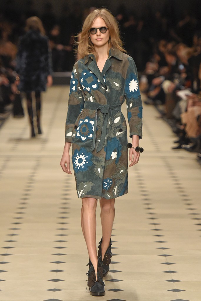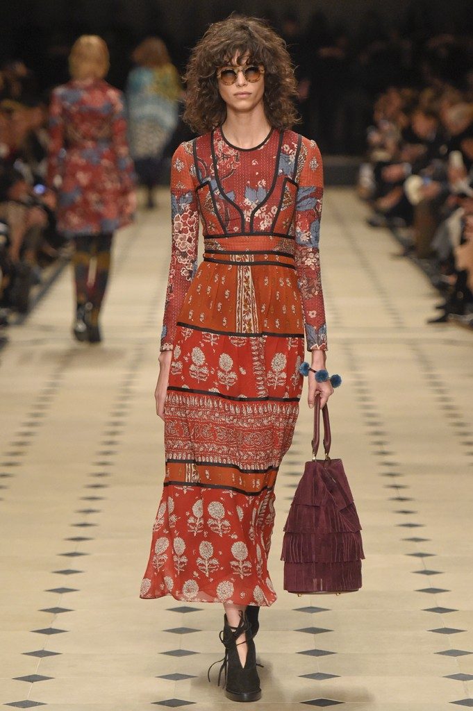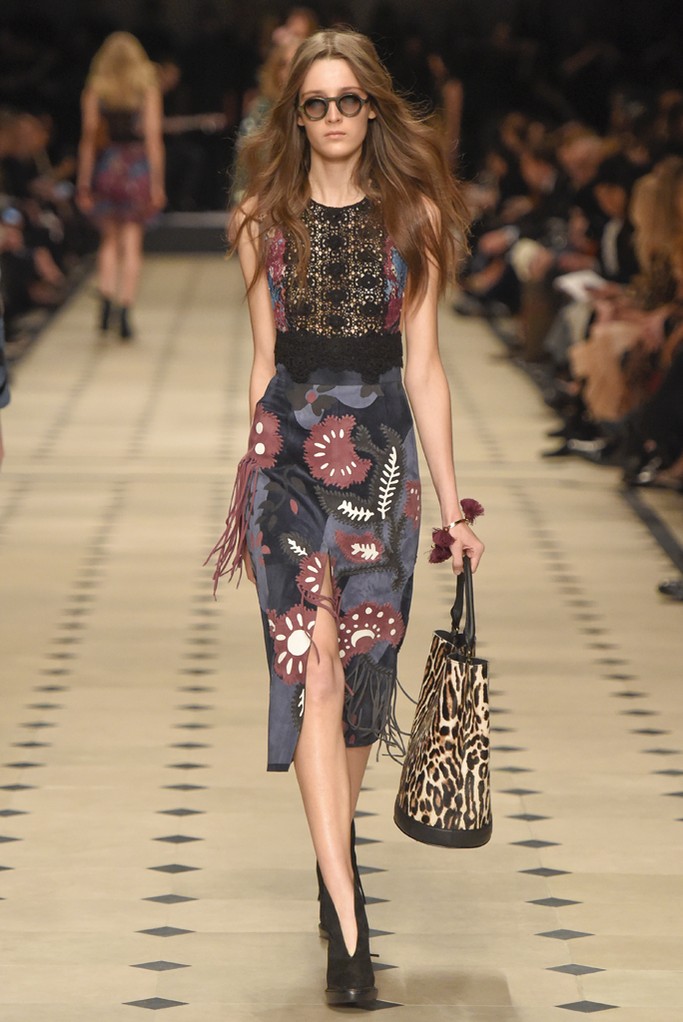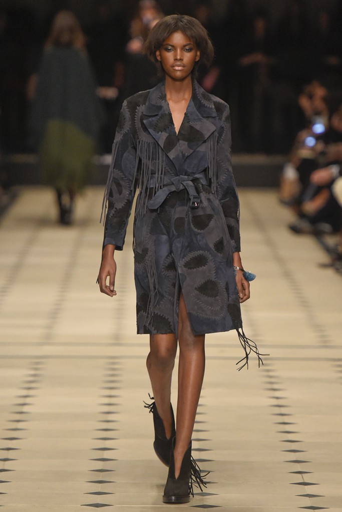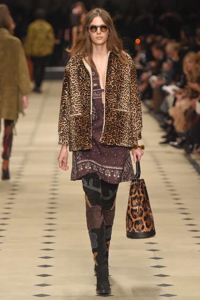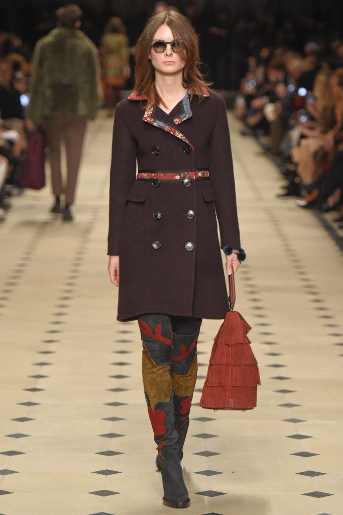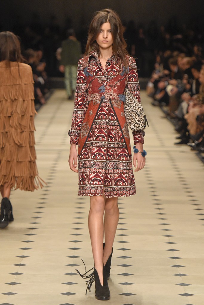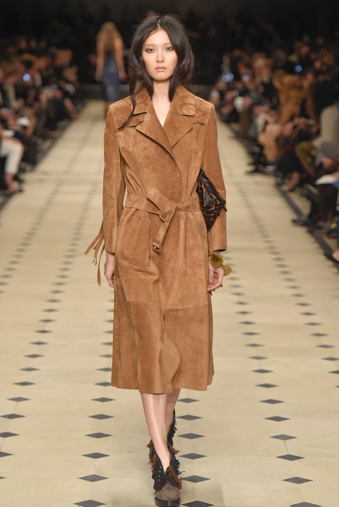 La legendaria marca que creó la gabardina en Inglaterra lanzó en Londres su colección para el otoño de 2015 influenciada por la moda de finales de los 60 y 70. Se vieron prendas como capas en gamuza, mantas tipo ponchos… Si los ponchos siguen de moda para este año y muchos flecos en carteras, botines e incluso en la parte de atrás de la irónica gabardina.