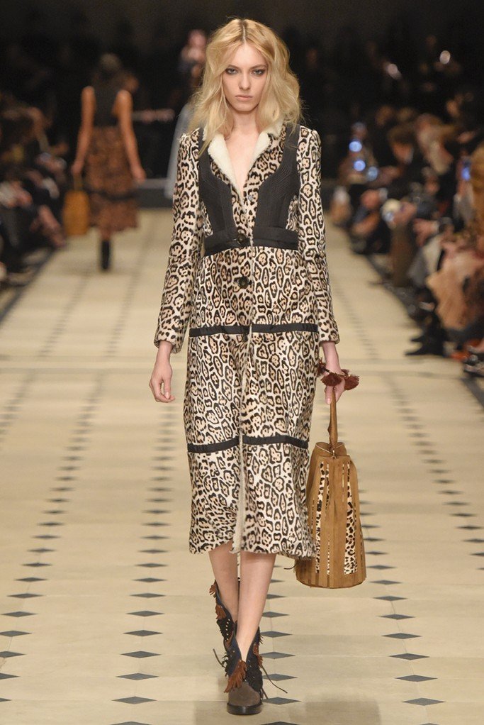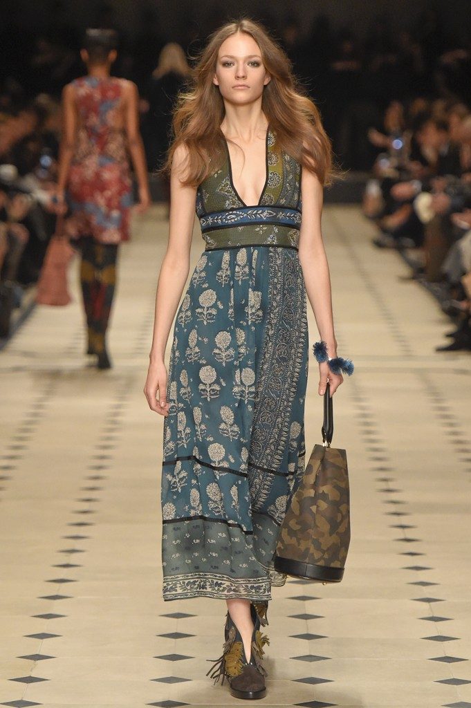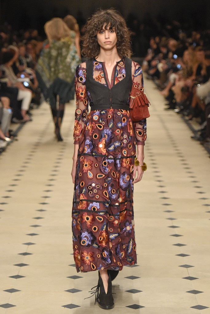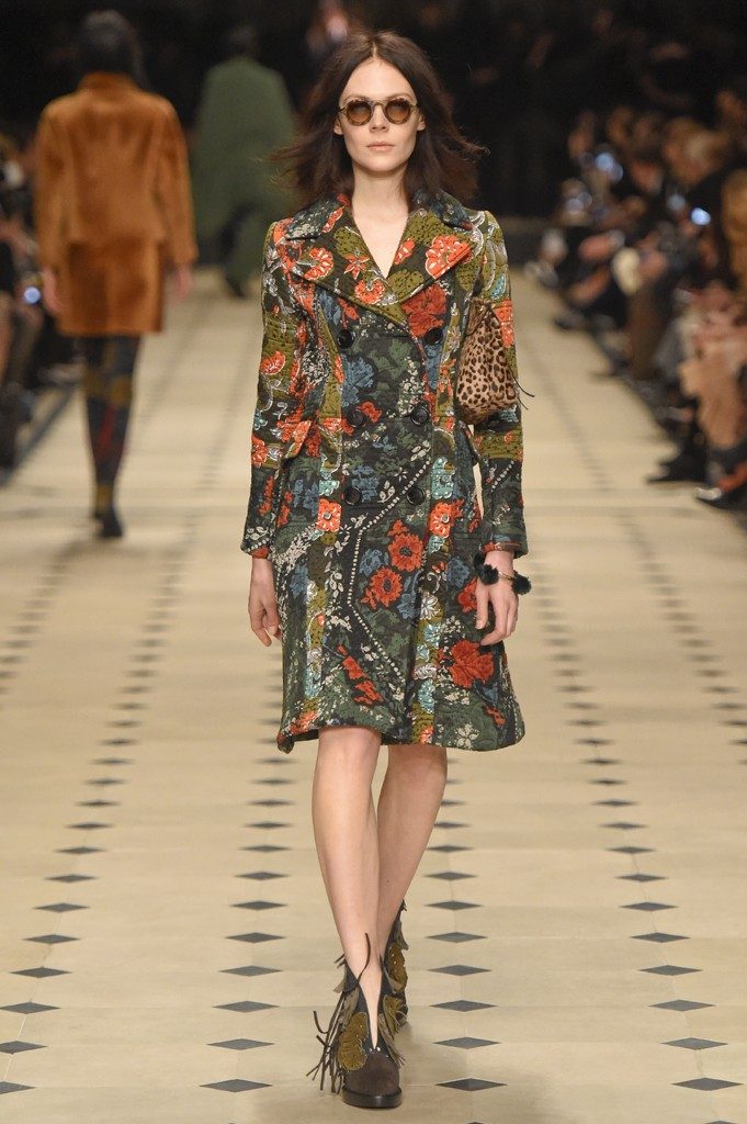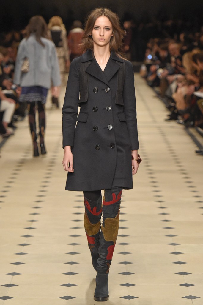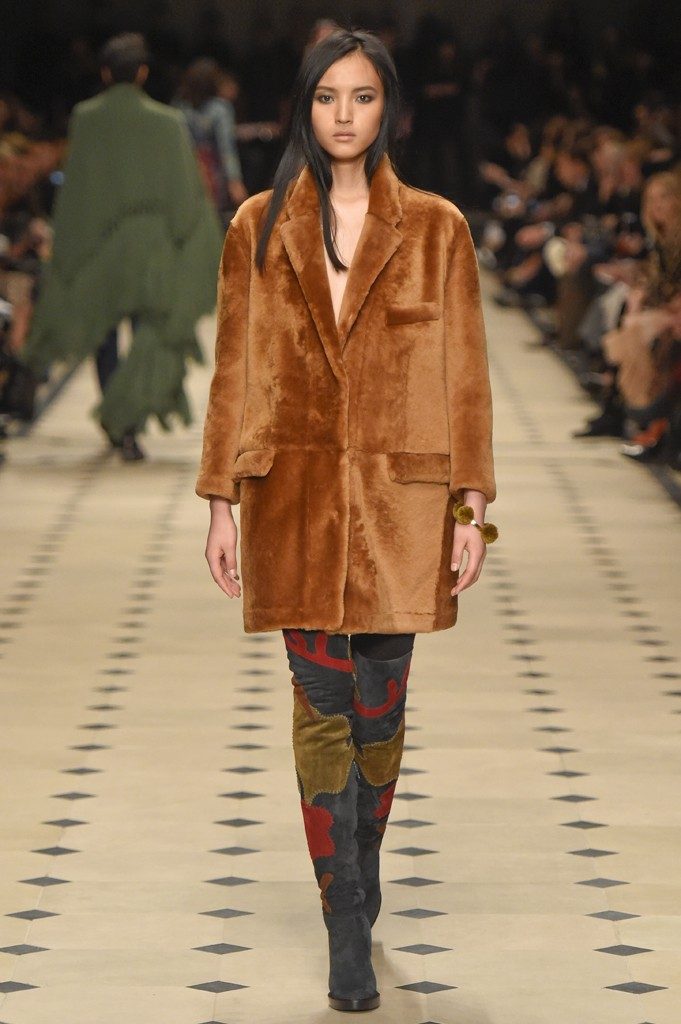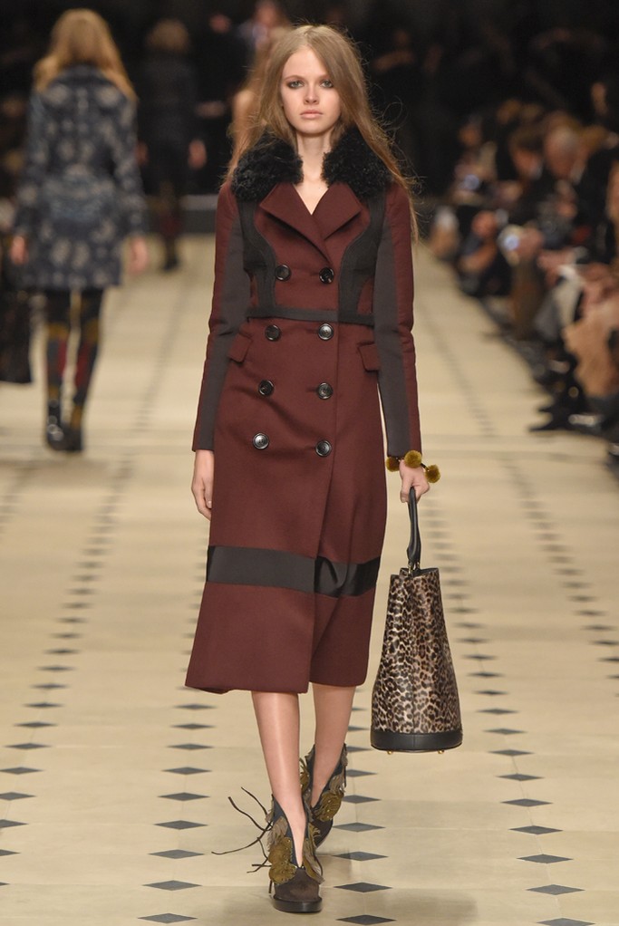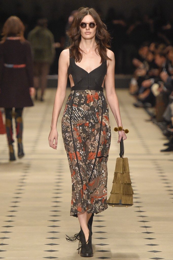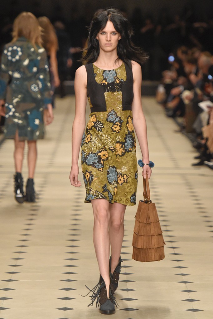 La legendaria marca que creó la gabardina en Inglaterra lanzó en Londres su colección para el otoño de 2015 influenciada por la moda de finales de los 60 y 70. Se vieron prendas como capas en gamuza, mantas tipo ponchos… Si los ponchos siguen de moda para este año y muchos flecos en carteras, botines e incluso en la parte de atrás de la irónica gabardina.