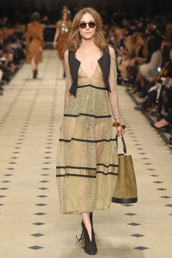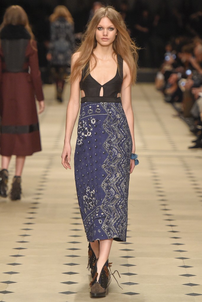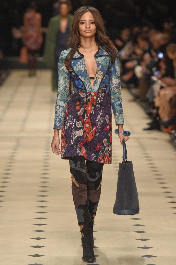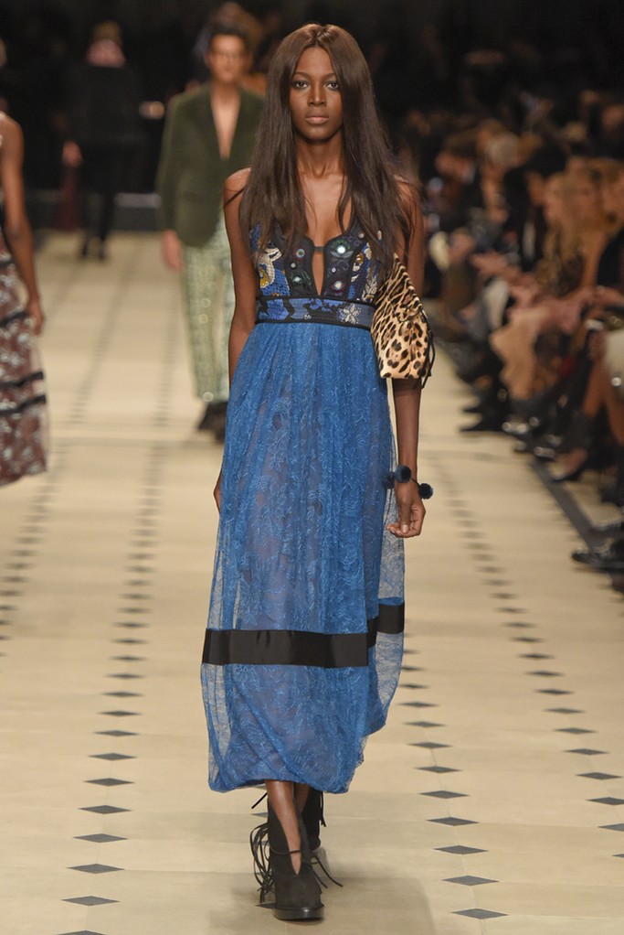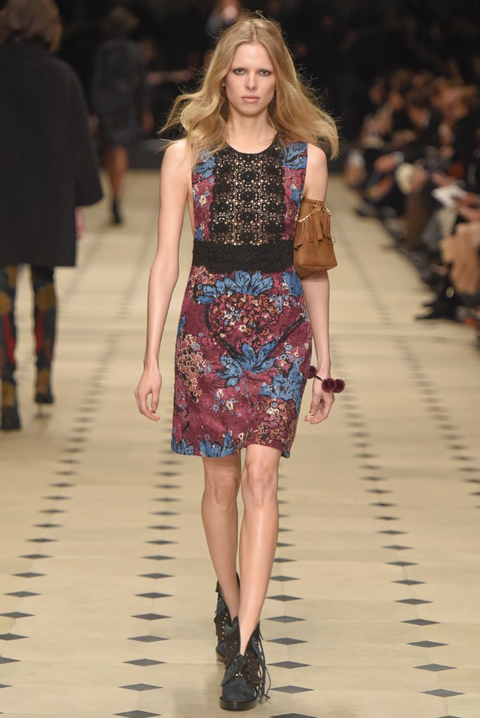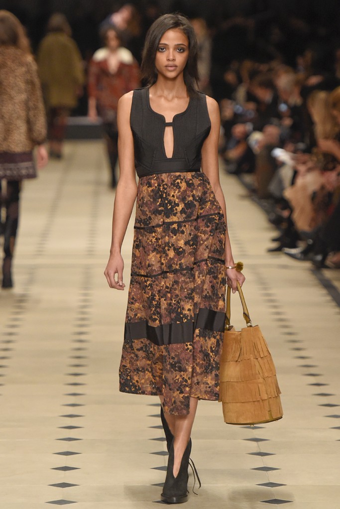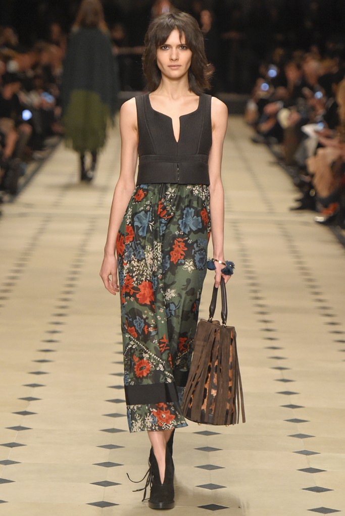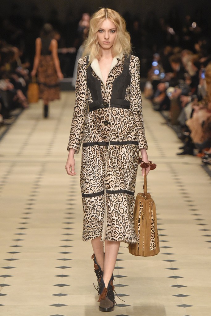 La legendaria marca que creó la gabardina en Inglaterra lanzó en Londres su colección para el otoño de 2015 influenciada por la moda de finales de los 60 y 70. Se vieron prendas como capas en gamuza, mantas tipo ponchos… Si los ponchos siguen de moda para este año y muchos flecos en carteras, botines e incluso en la parte de atrás de la irónica gabardina.
