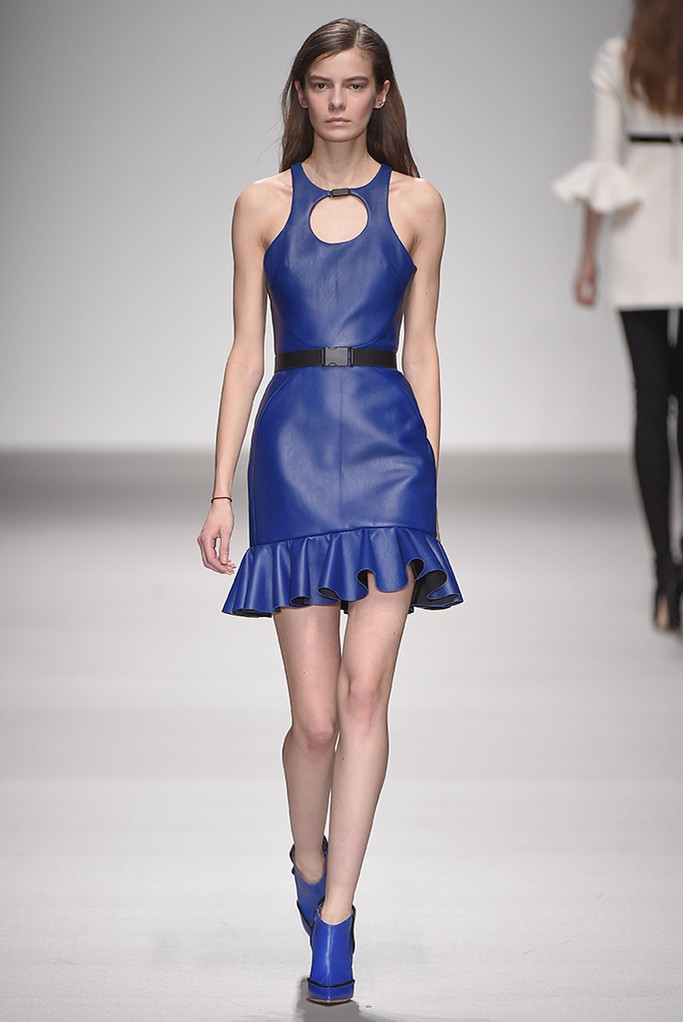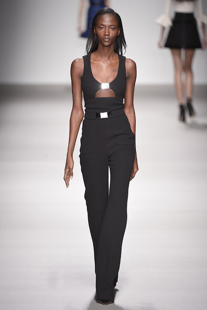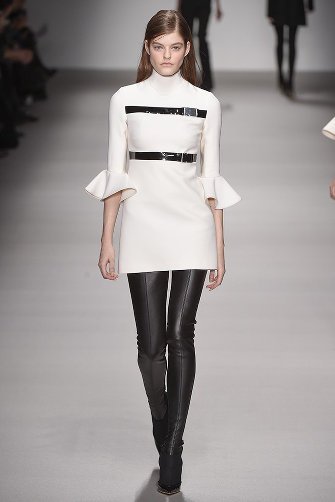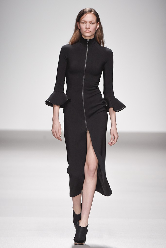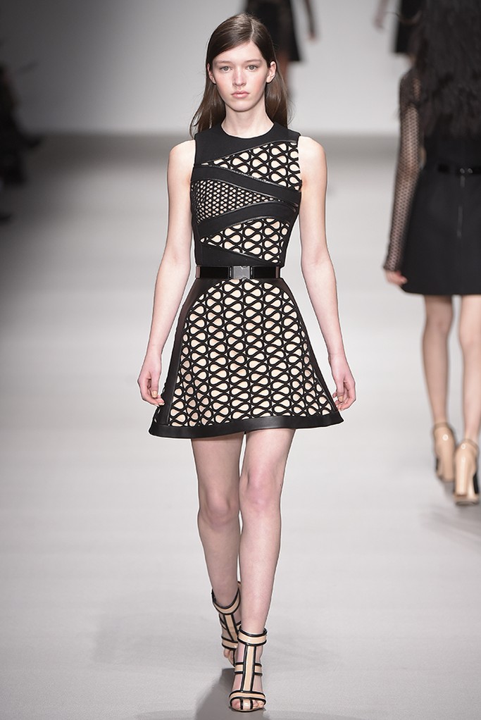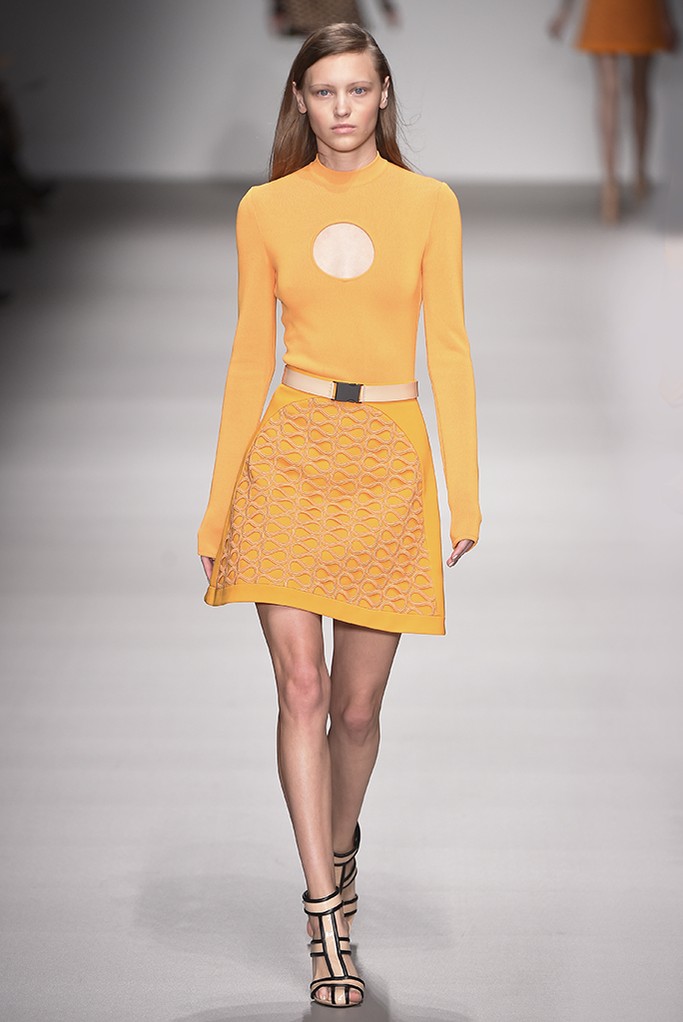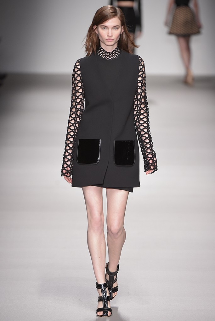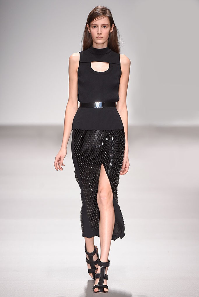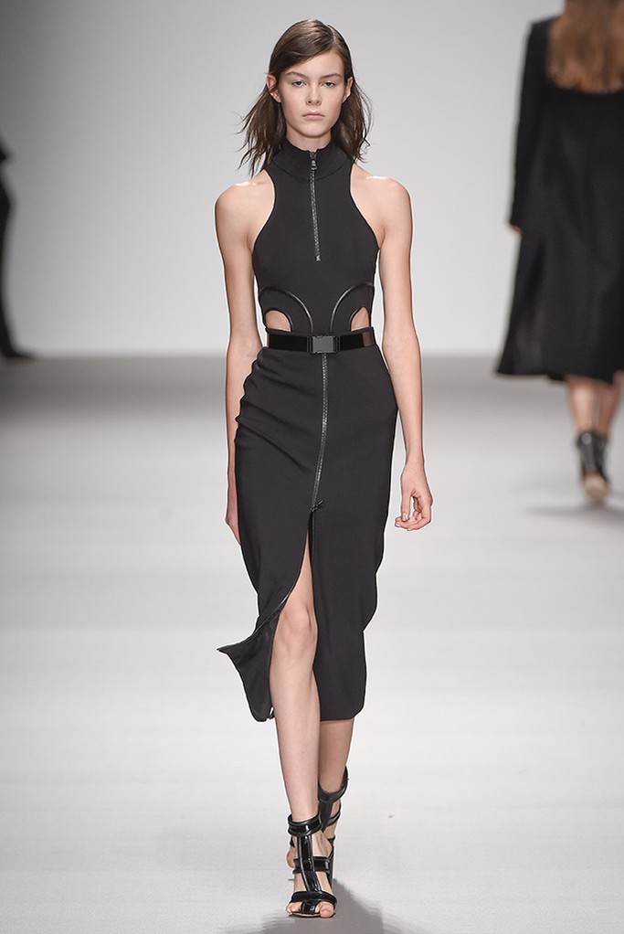 Una colección con aire futurista se vio en la pasarela con telas rígidas, aberturas geométricas en los vestidos, un poco de transparencia y cuero. Una colección en tonos sólidos y minimalista.