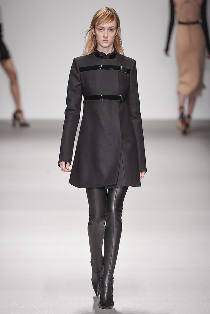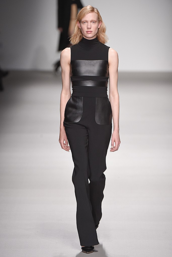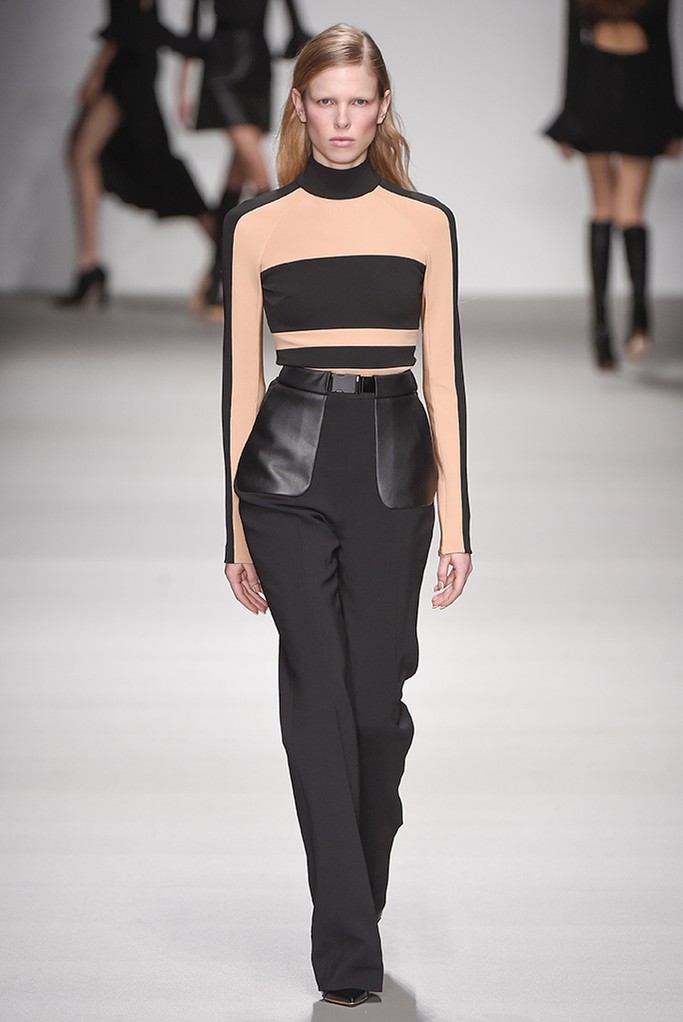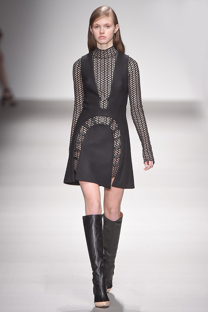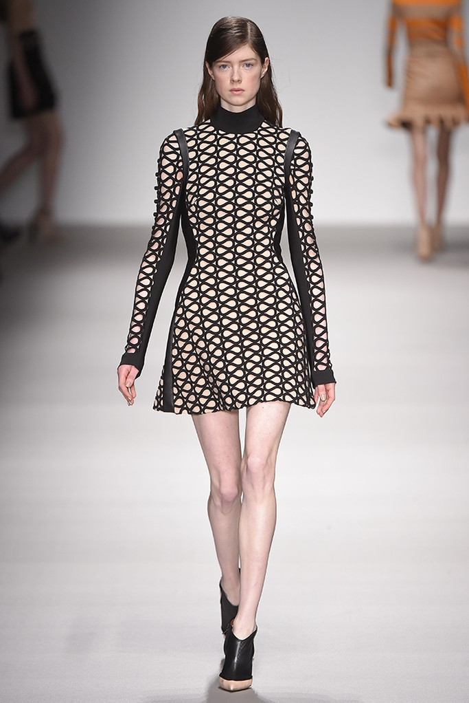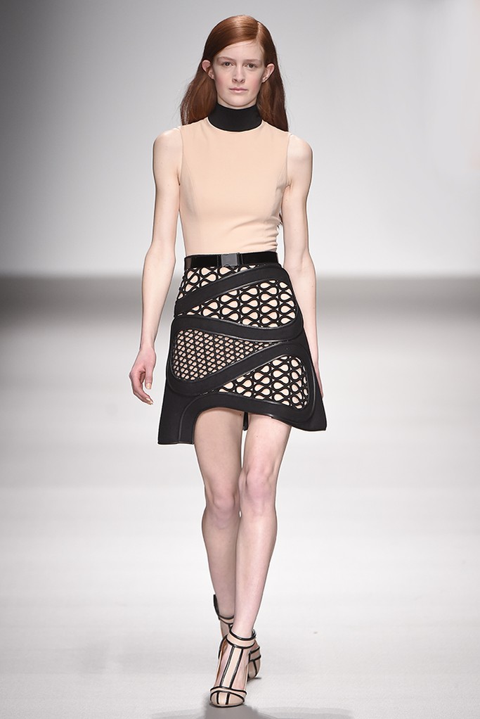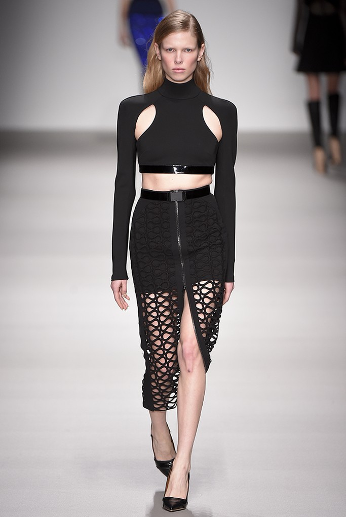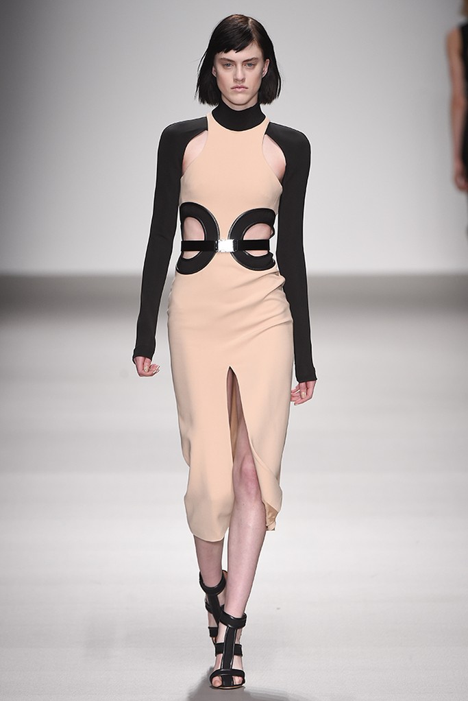 Una colección con aire futurista se vio en la pasarela con telas rígidas, aberturas geométricas en los vestidos, un poco de transparencia y cuero. Una colección en tonos sólidos y minimalista.
