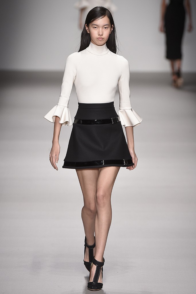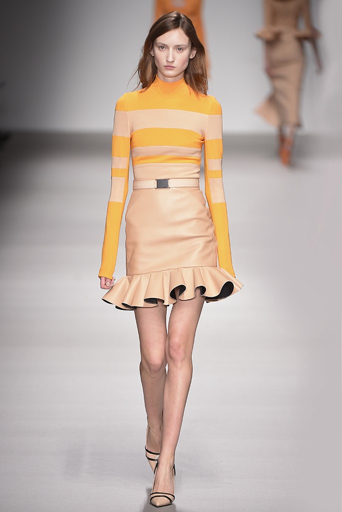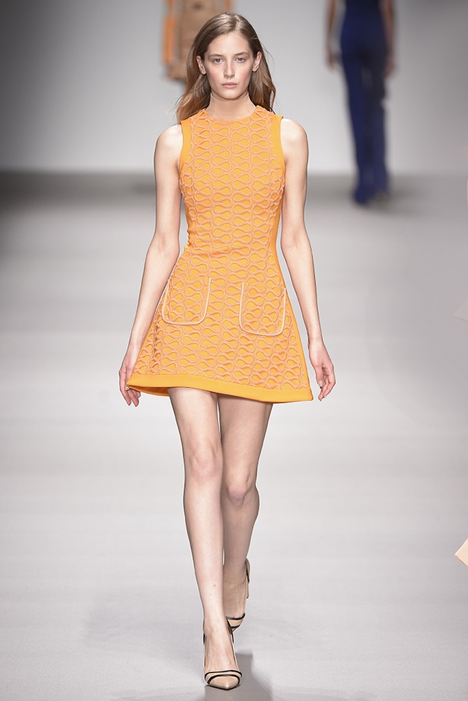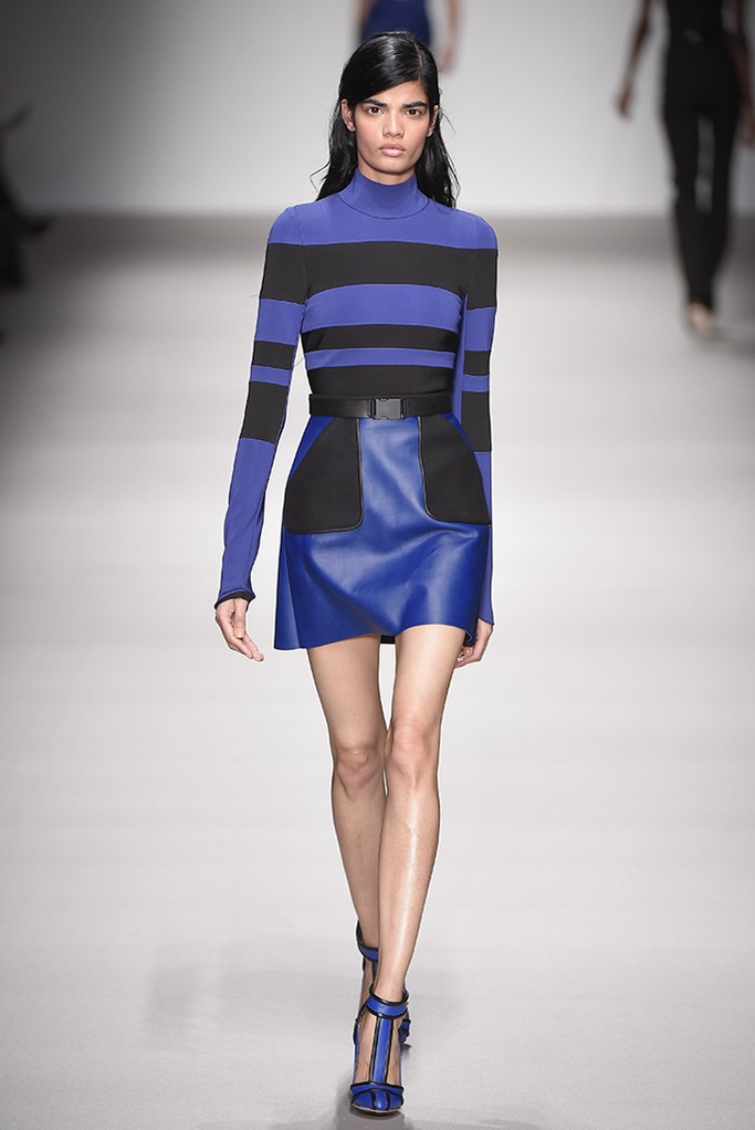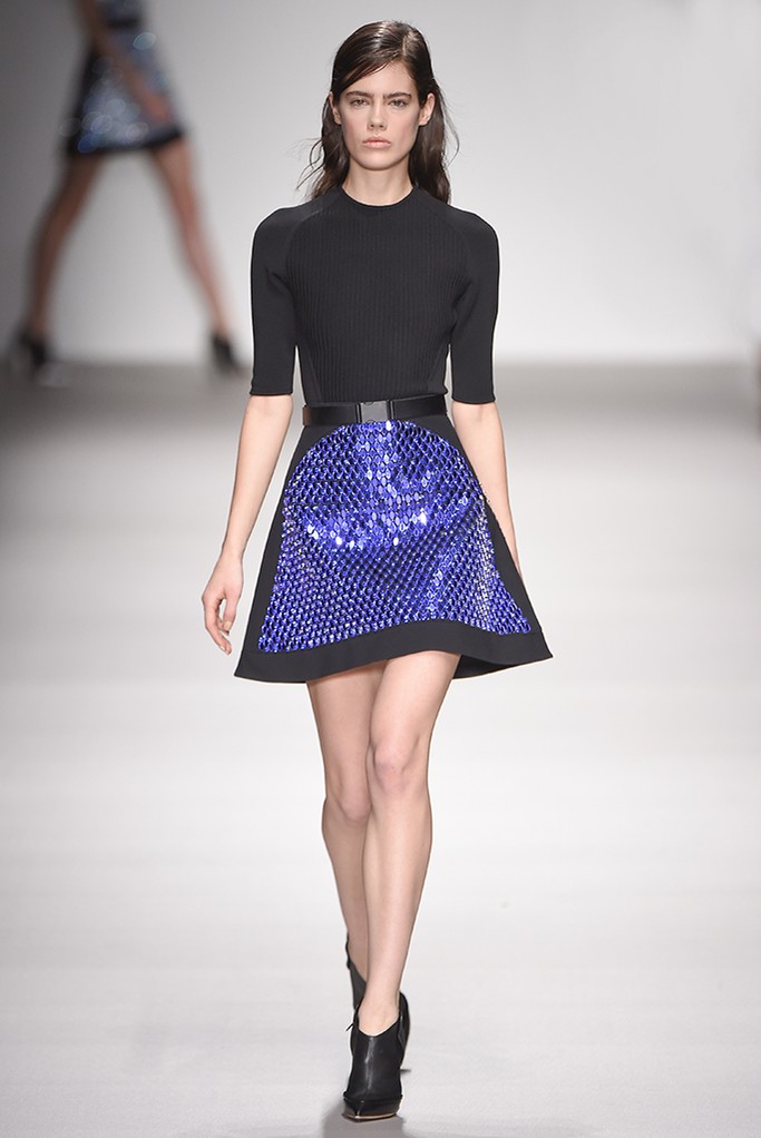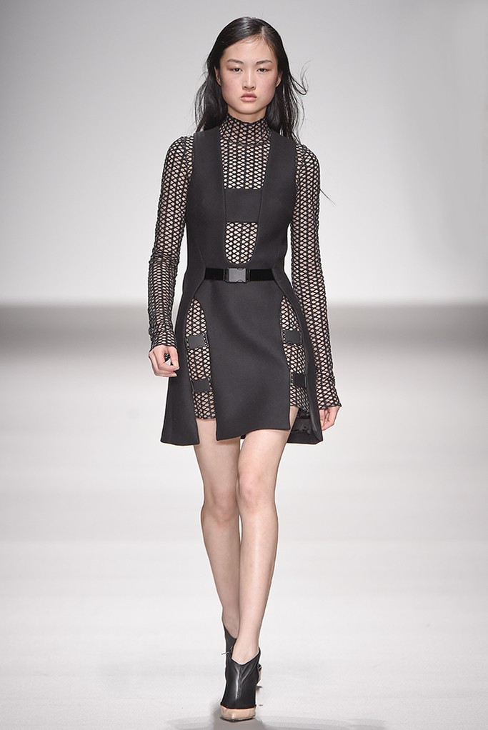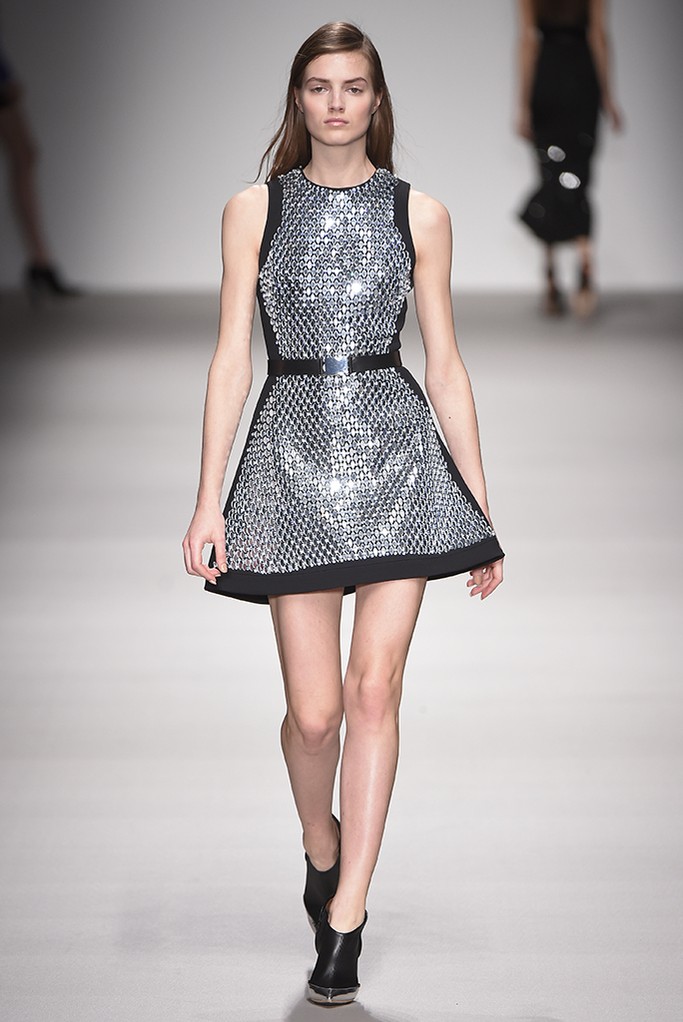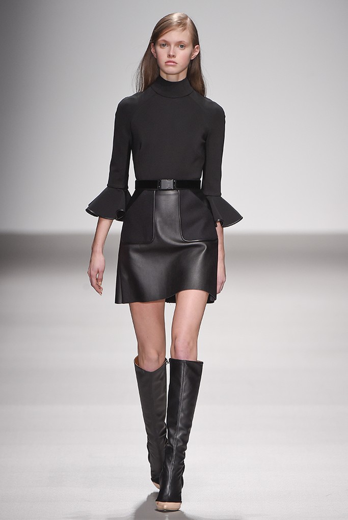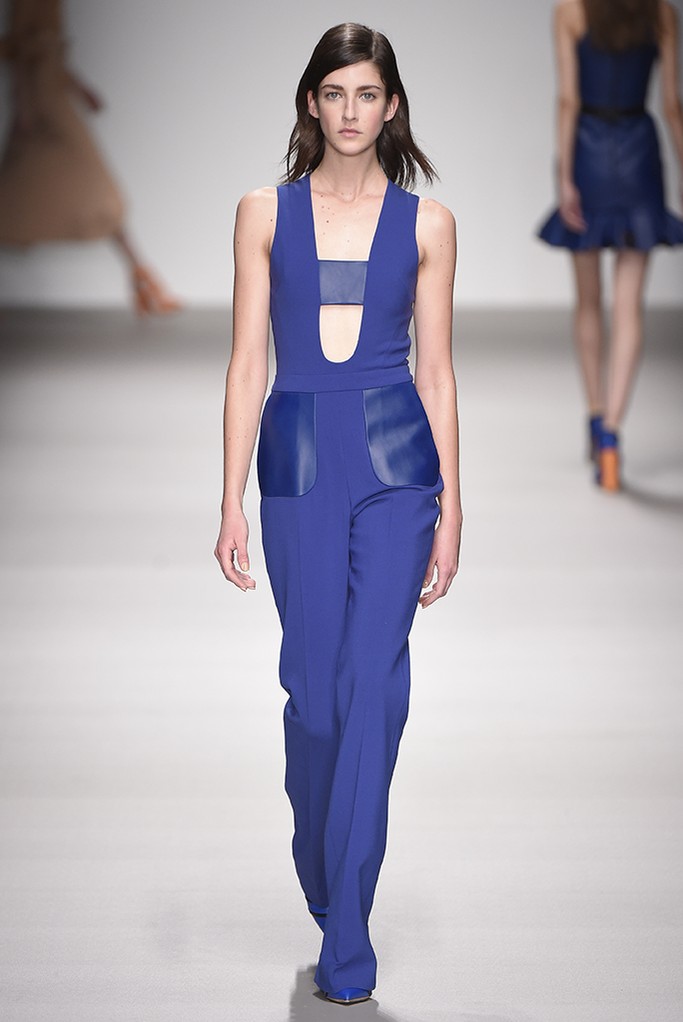 Una colección con aire futurista se vio en la pasarela con telas rígidas, aberturas geométricas en los vestidos, un poco de transparencia y cuero. Una colección en tonos sólidos y minimalista.