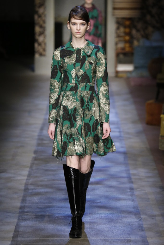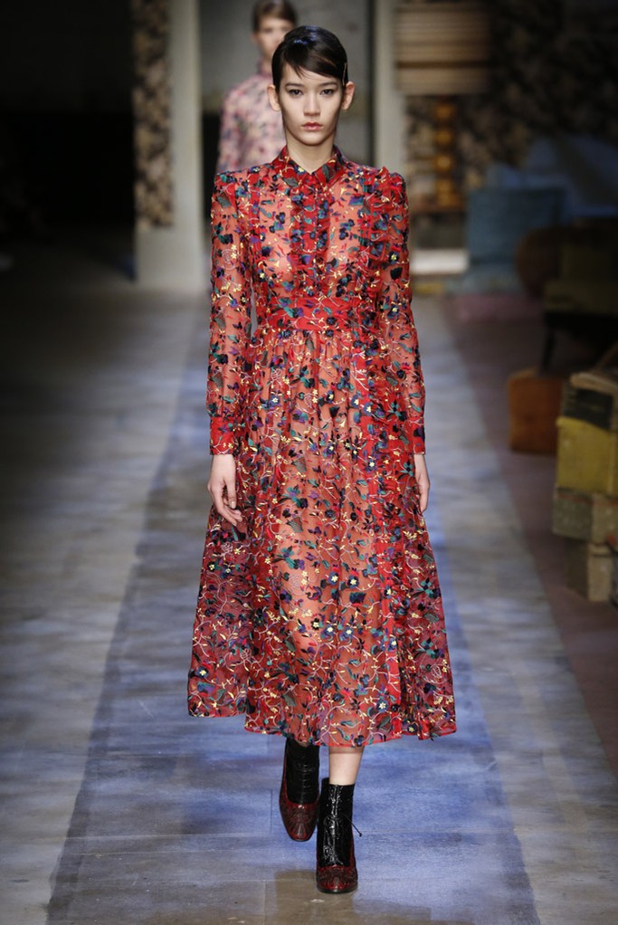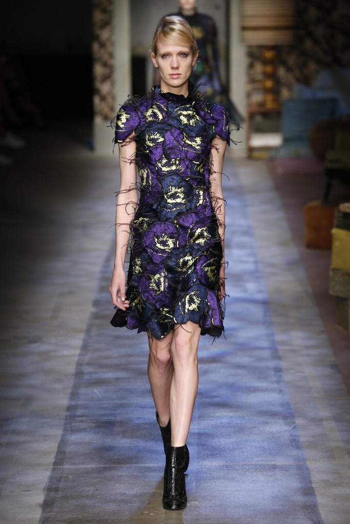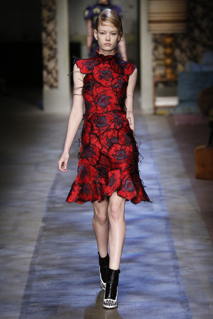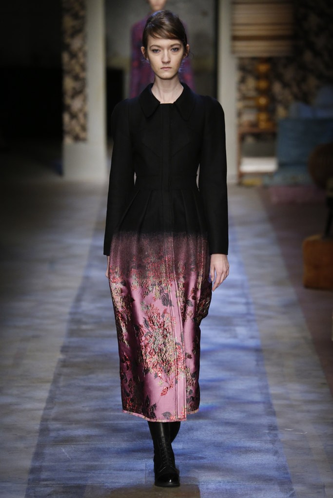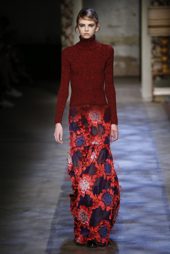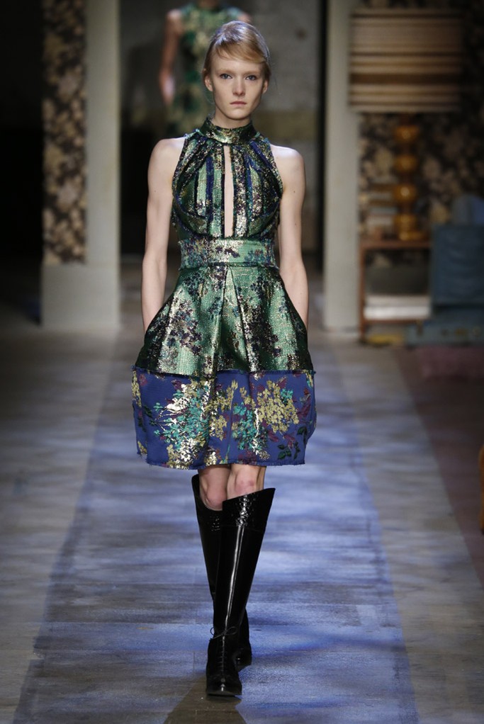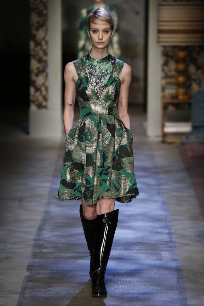 Con una onda barroca y muy romántica Erdem presento una colección cargada de estampados en formas de hojas y los colores de la naturaleza. Se vieron vestidos en jacquard metalizados con faldas en A y diferentes texturas que dan un efecto 3D a las prendas.