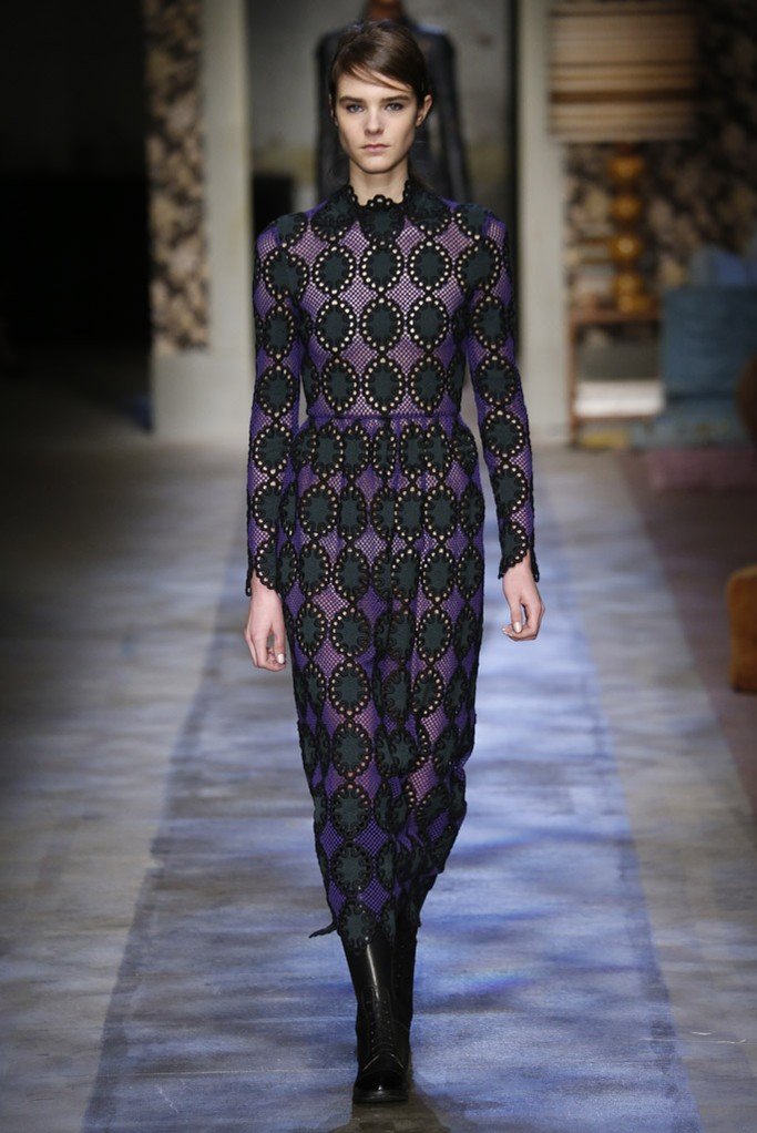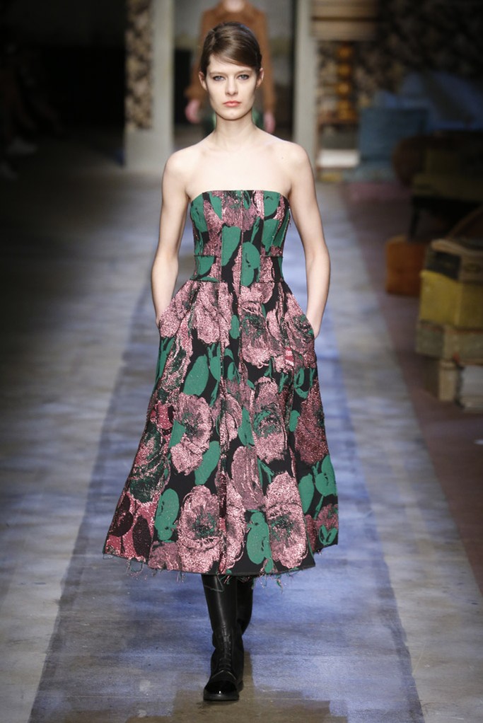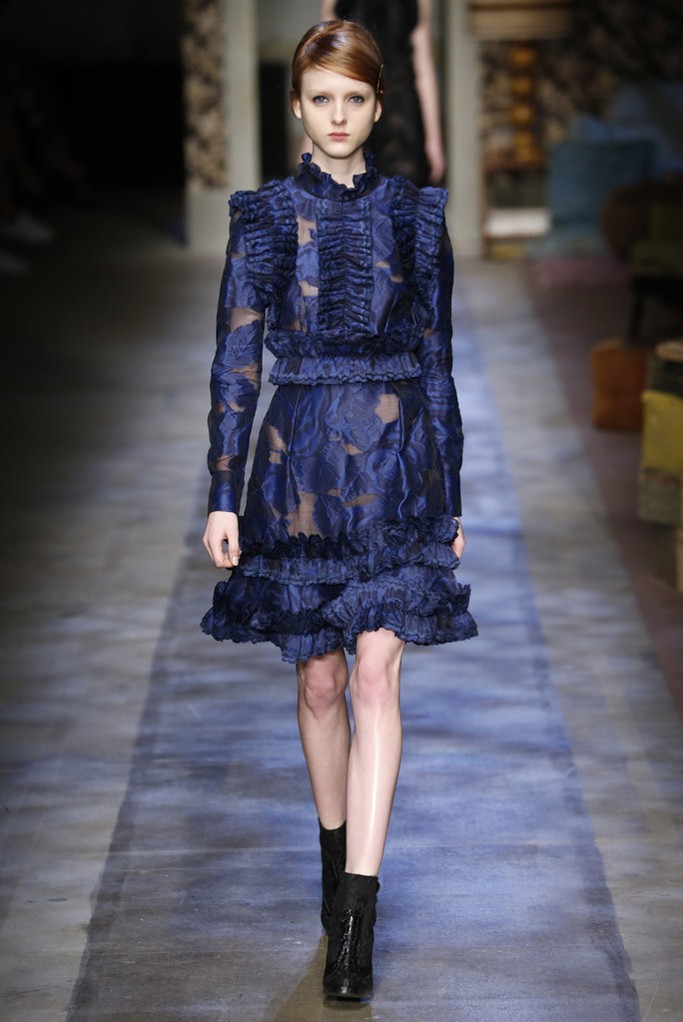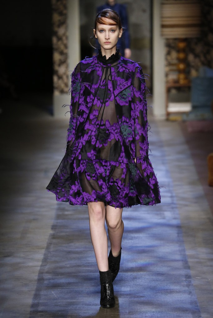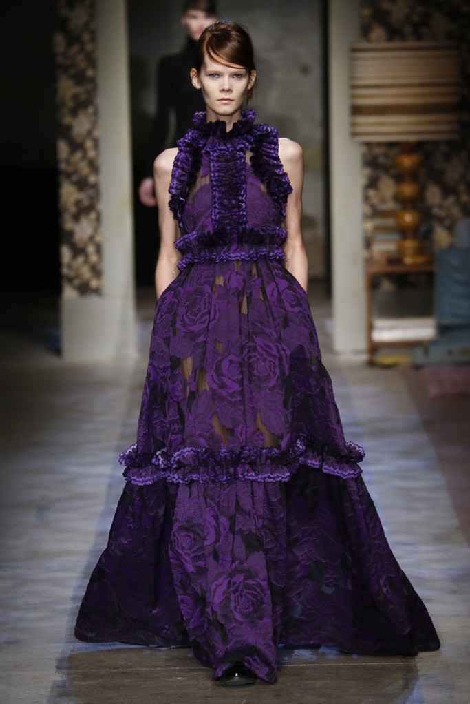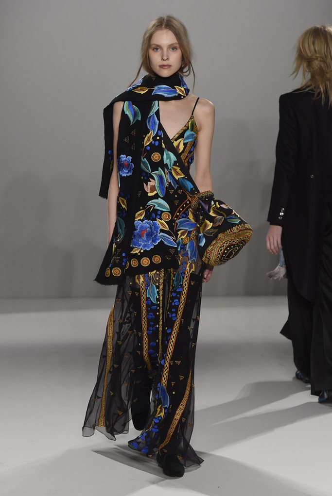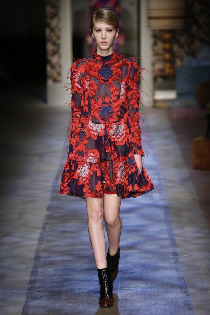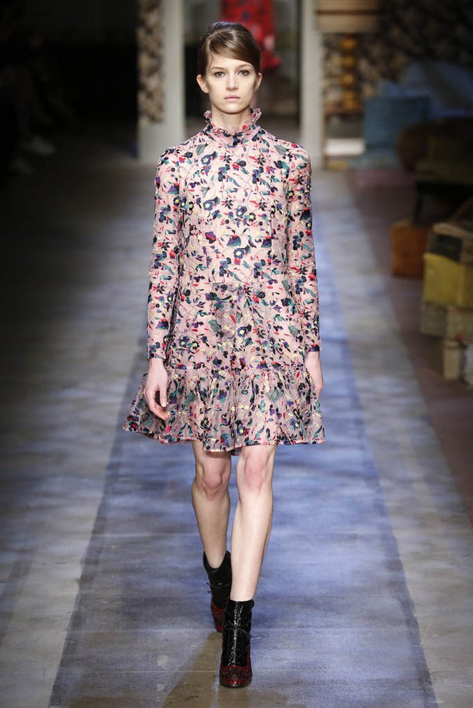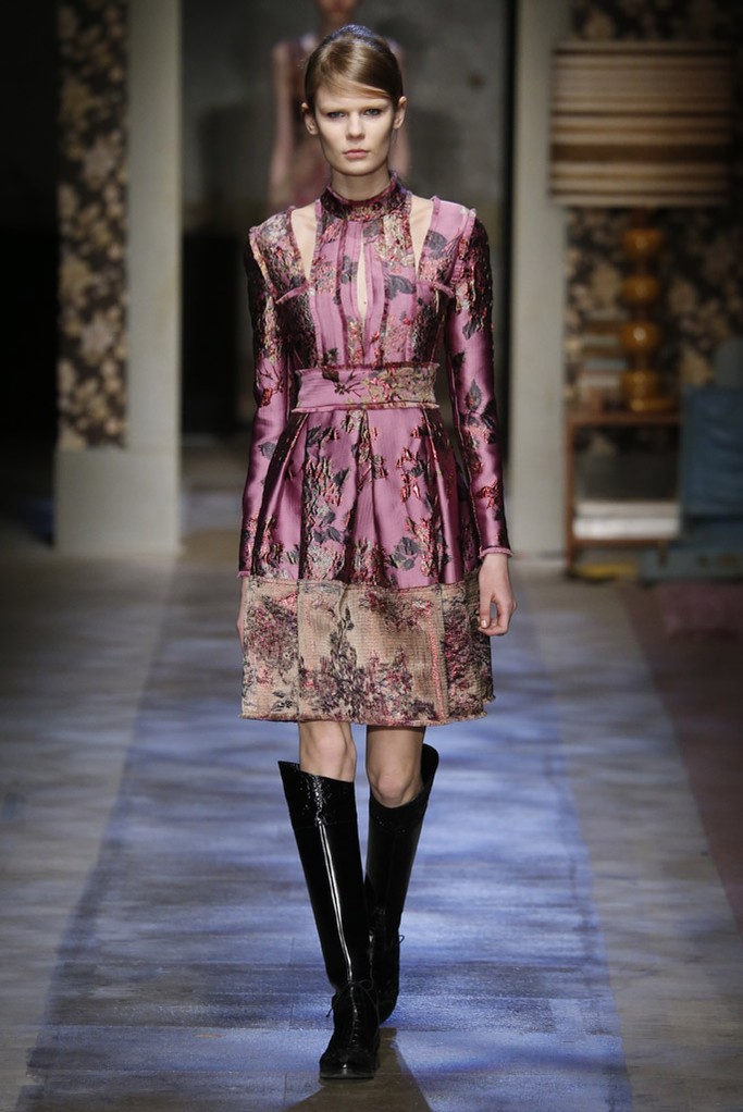 Con una onda barroca y muy romántica Erdem presento una colección cargada de estampados en formas de hojas y los colores de la naturaleza. Se vieron vestidos en jacquard metalizados con faldas en A y diferentes texturas que dan un efecto 3D a las prendas.