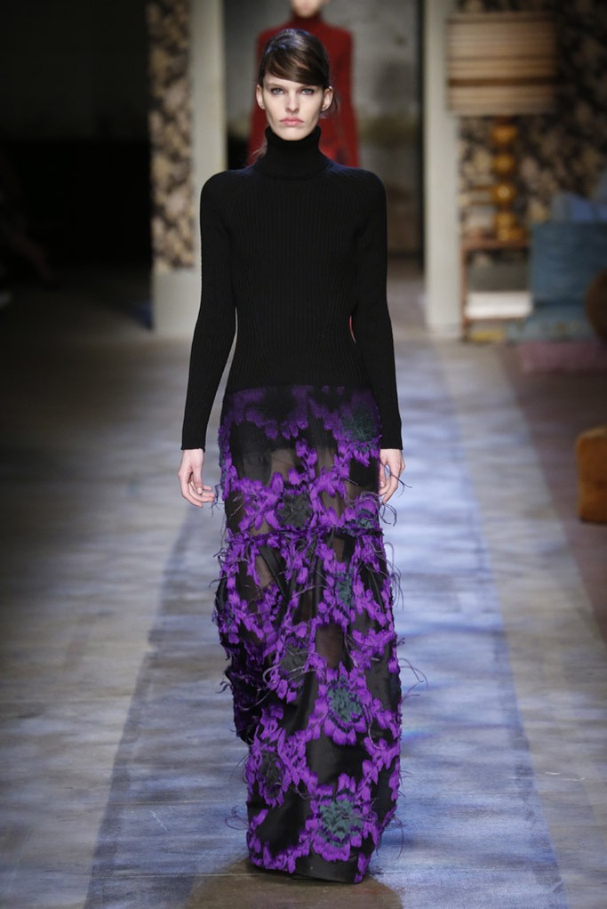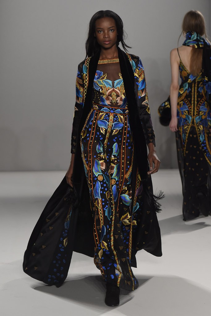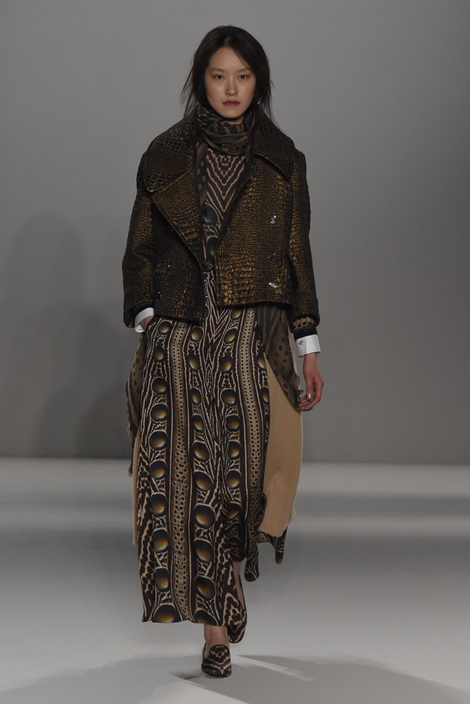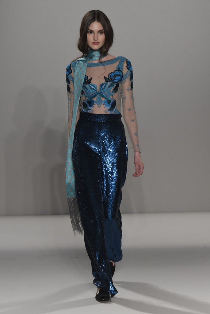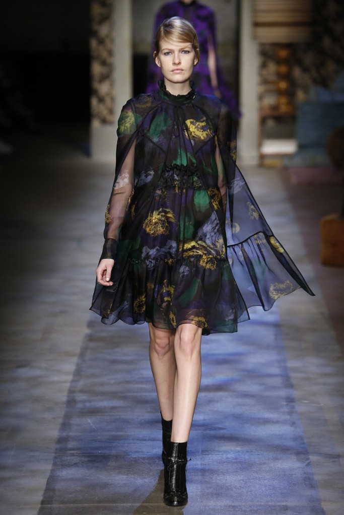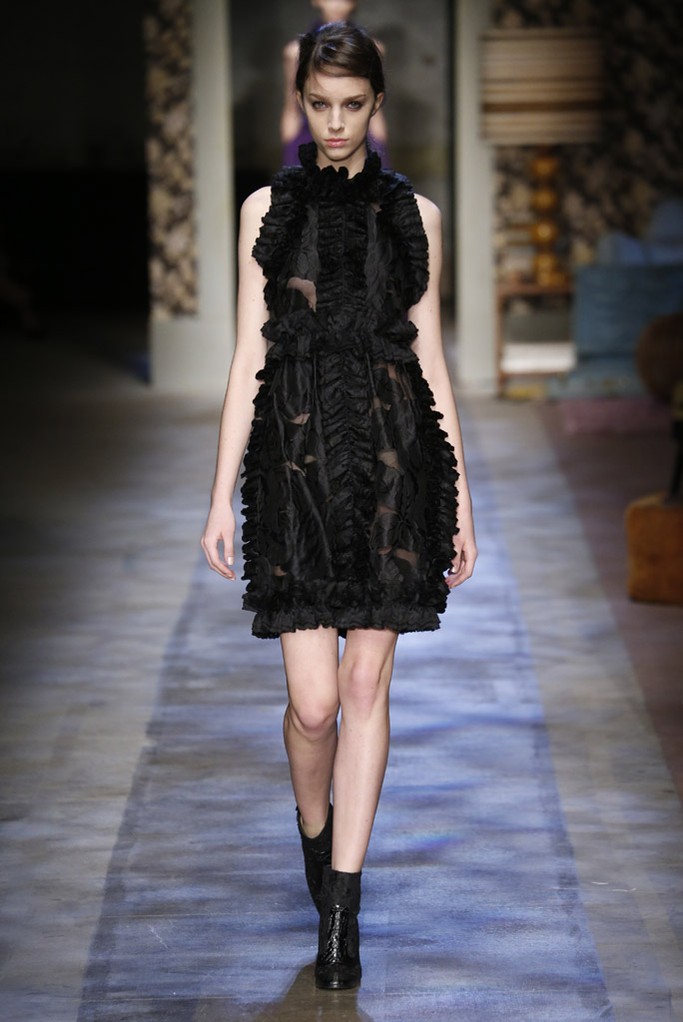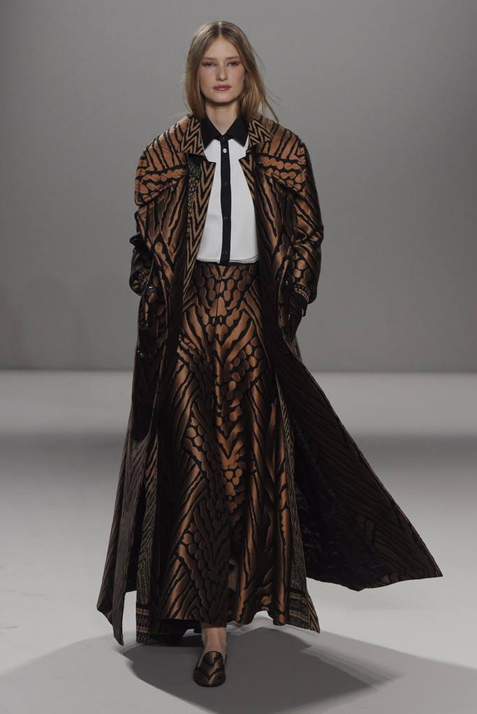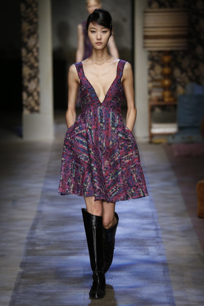 Con una onda barroca y muy romántica Erdem presento una colección cargada de estampados en formas de hojas y los colores de la naturaleza. Se vieron vestidos en jacquard metalizados con faldas en A y diferentes texturas que dan un efecto 3D a las prendas.