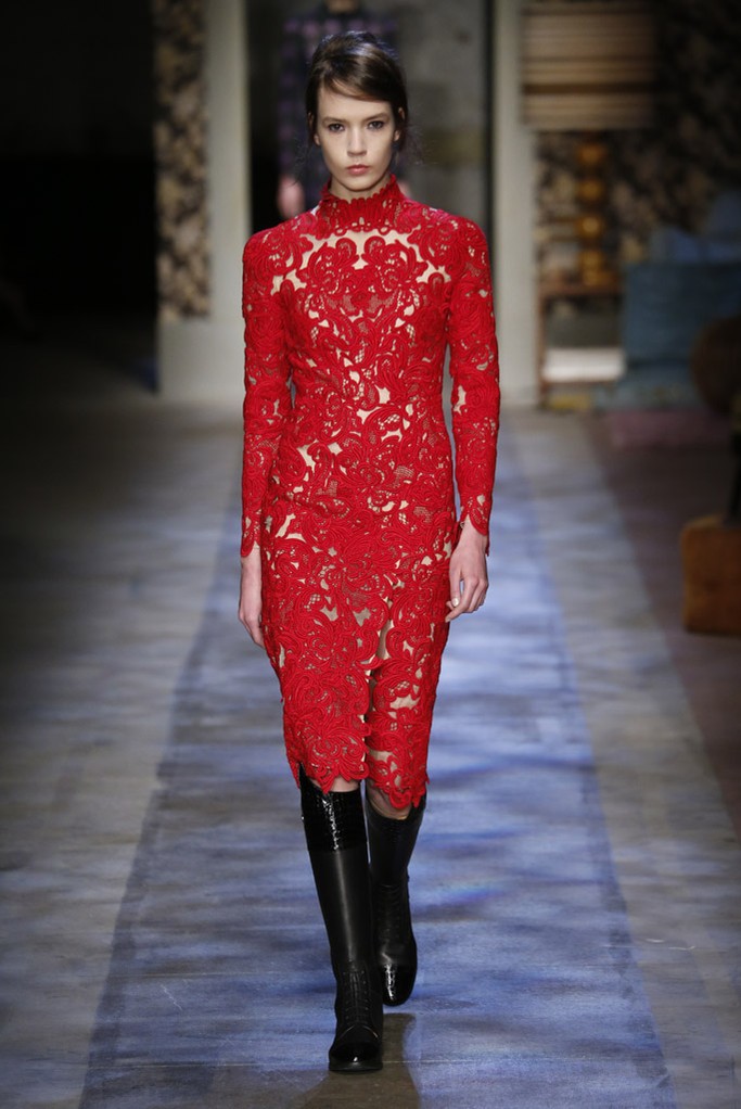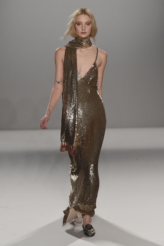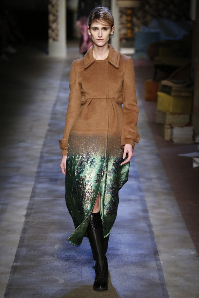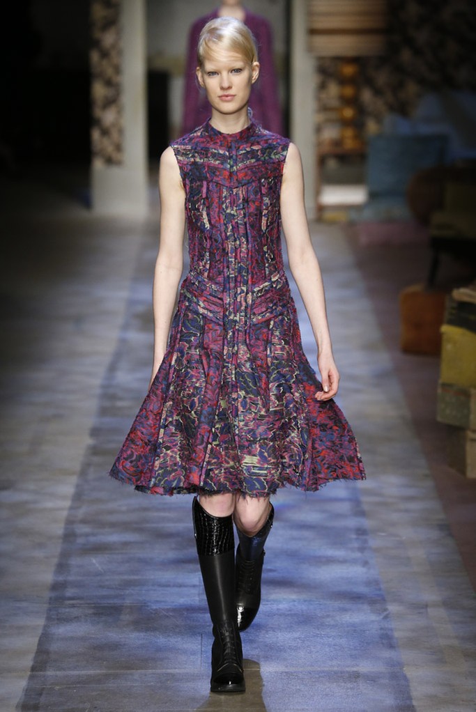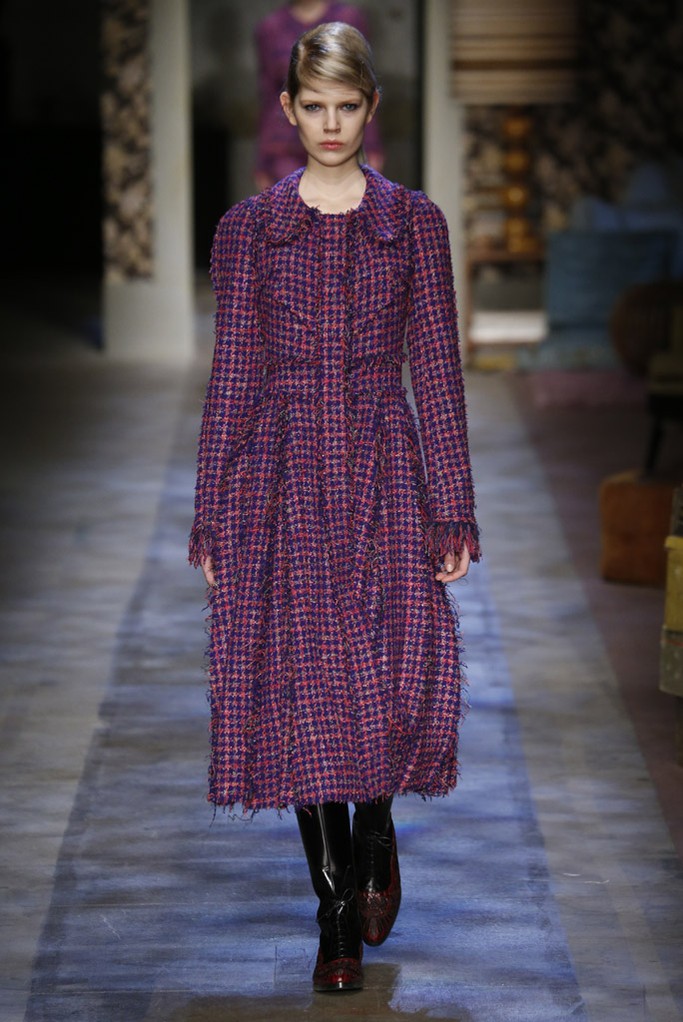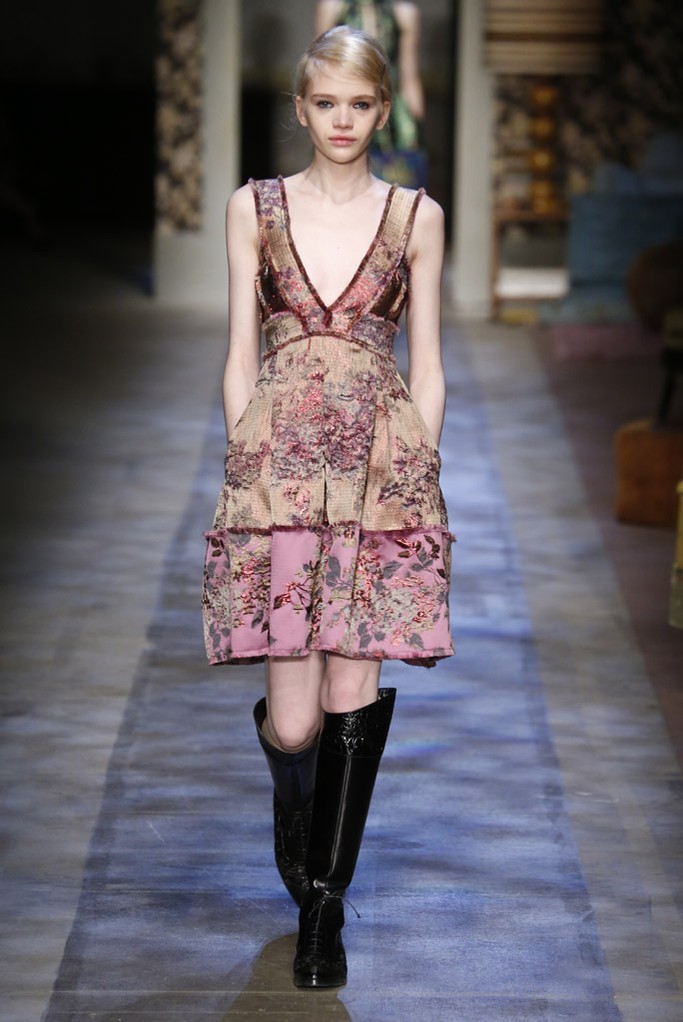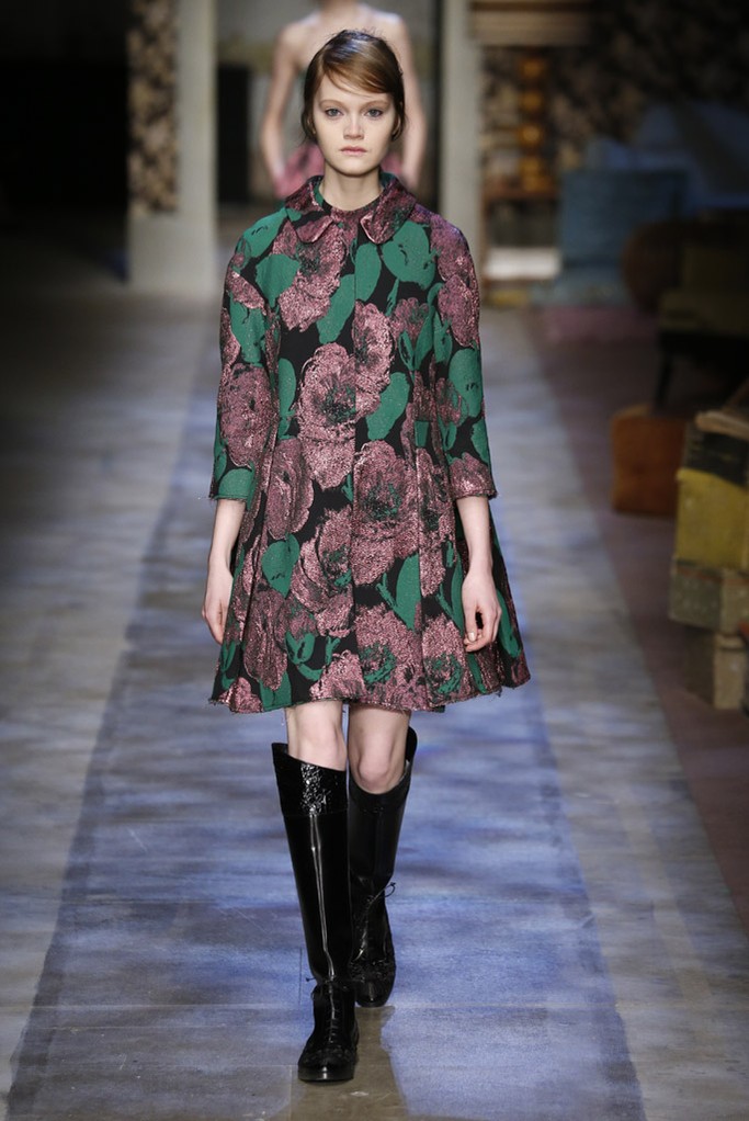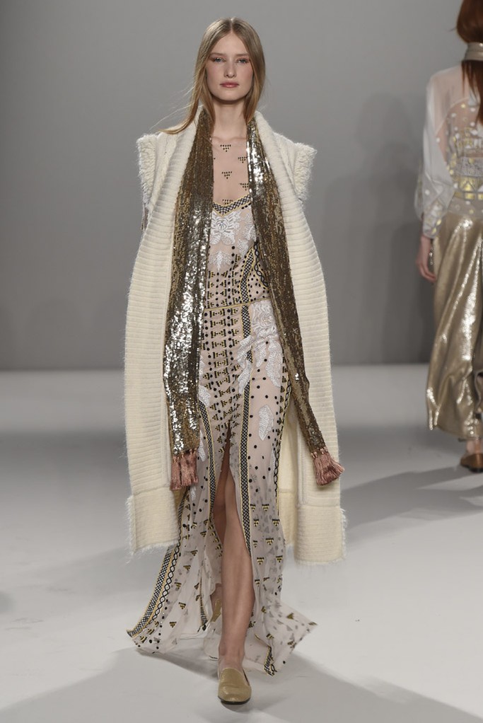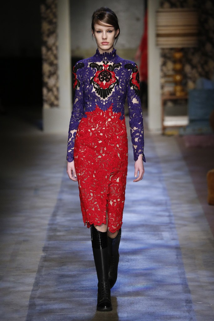 Con una onda barroca y muy romántica Erdem presento una colección cargada de estampados en formas de hojas y los colores de la naturaleza. Se vieron vestidos en jacquard metalizados con faldas en A y diferentes texturas que dan un efecto 3D a las prendas.